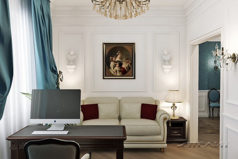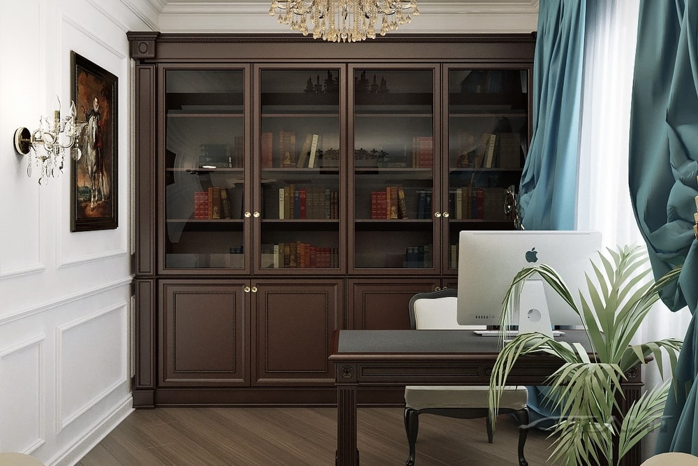 Поскольку площадь кабинета небольшая, решено было оставить стены белыми. Насыщенный синий сделал бы комнату мрачной и холодной. Классика с элементами дворцового стиля не приемлет бюджетных материалов, поэтому дизайнеры отдали предпочтение стильной и дорогой мебели. Оцените шкаф из массива.