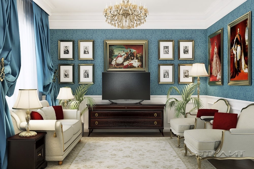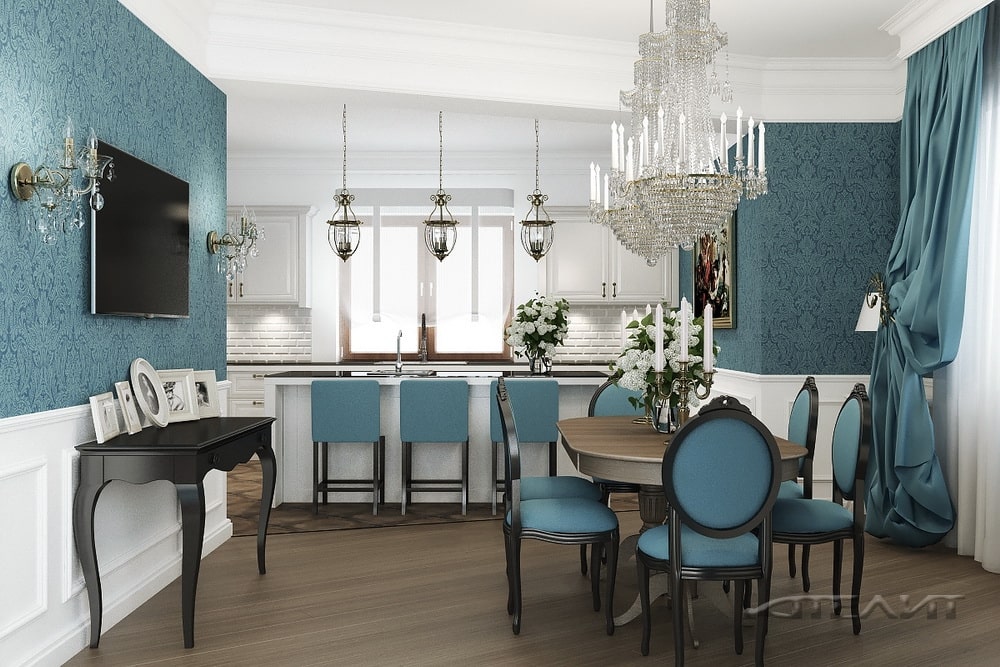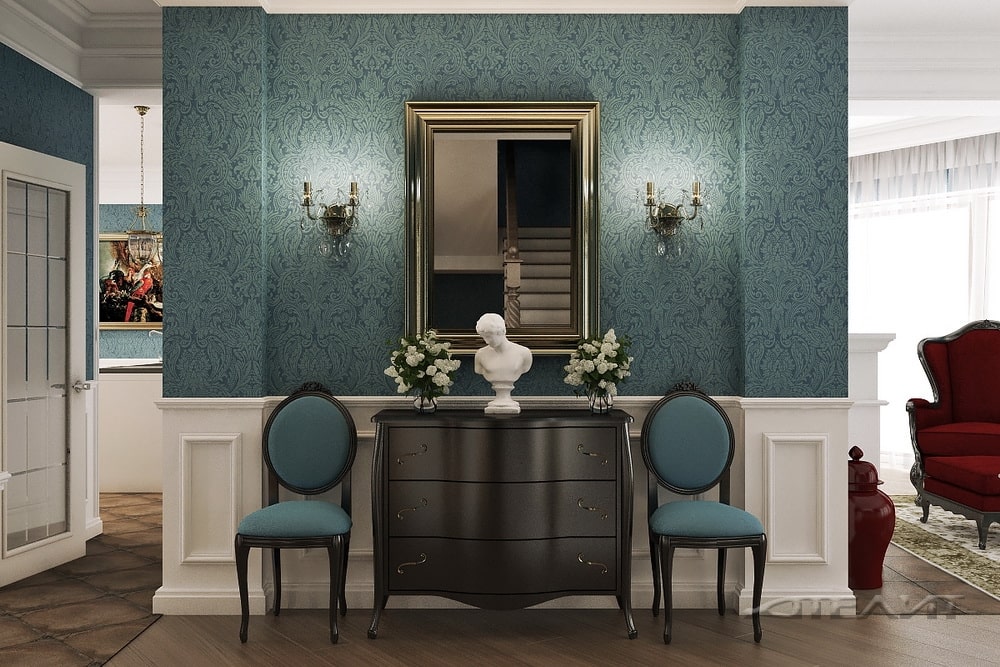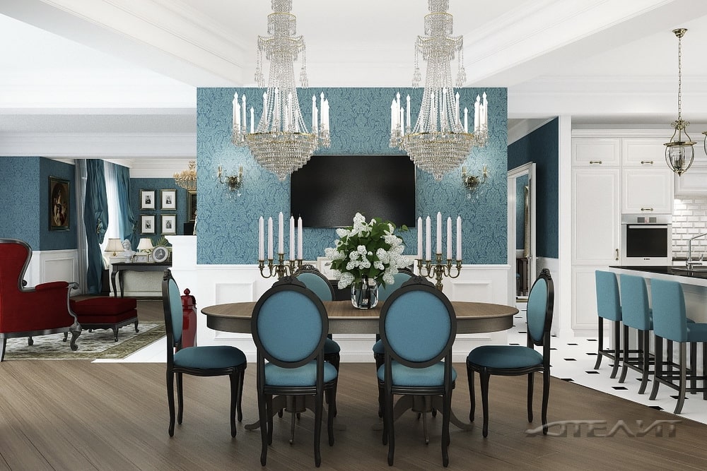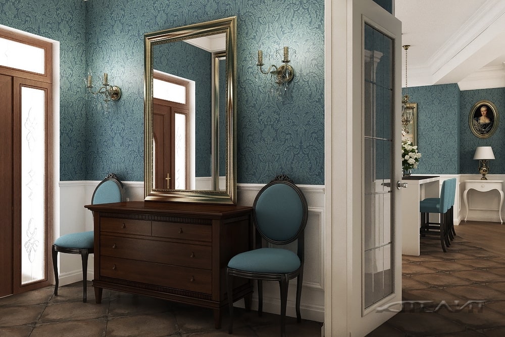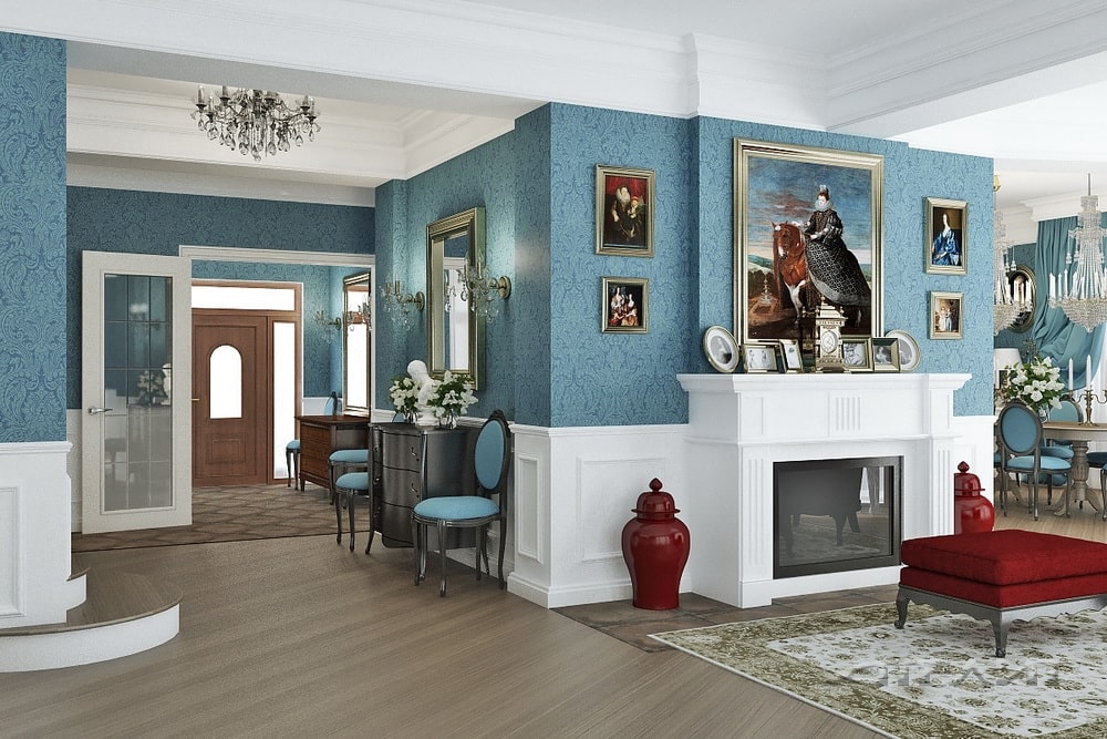 Интерьер дома было решено оформить в классическом стиле. Дизайнеры выбрали сочетание синего и белого, добавили небольшие акценты бордового. Проект получился стильным и понравился хозяевам.
