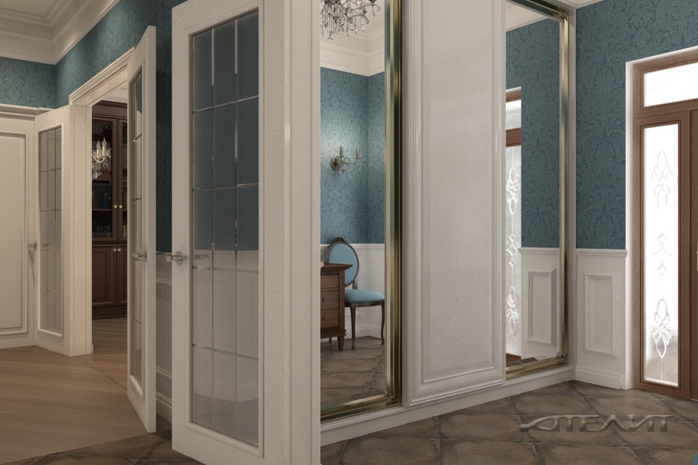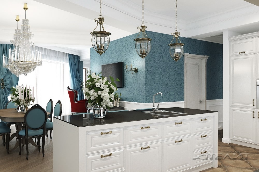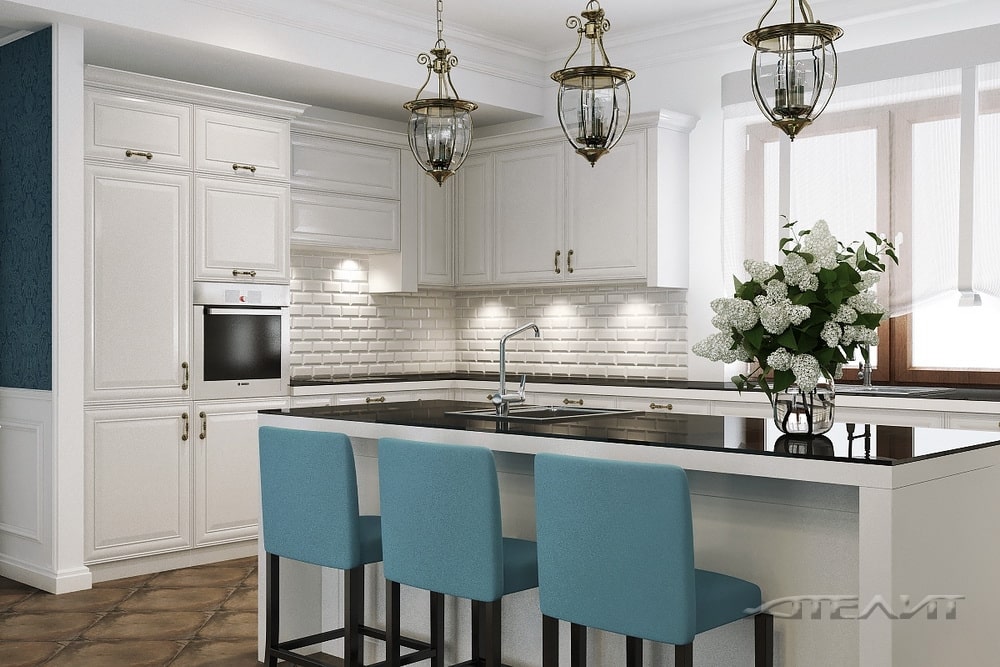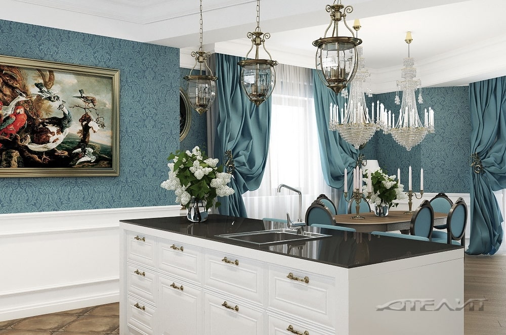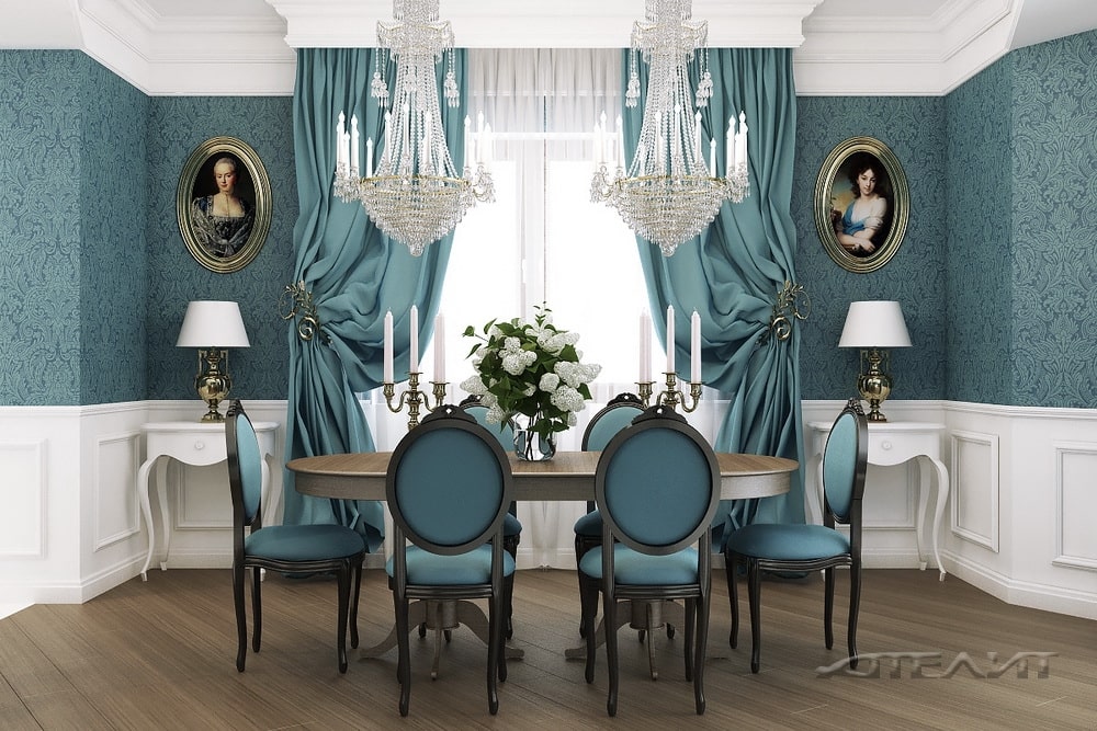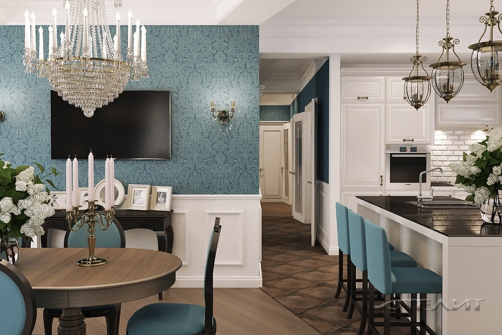 Интерьер дома было решено оформить в классическом стиле. Дизайнеры выбрали сочетание синего и белого, добавили небольшие акценты бордового. Проект получился стильным и понравился хозяевам.