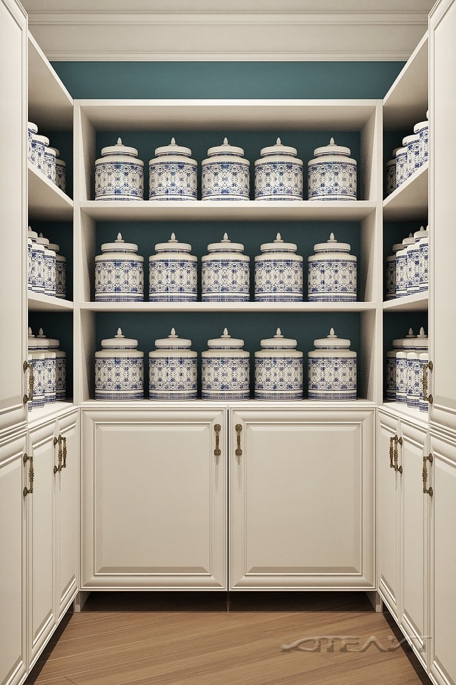 В кладовой все просто и функционально. Шкафы с открытыми и закрытыми секциями позволяют разместить на удобное хранение запасы хозяев.