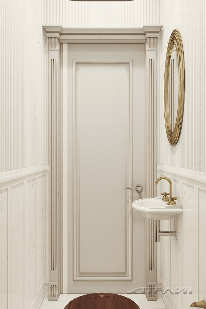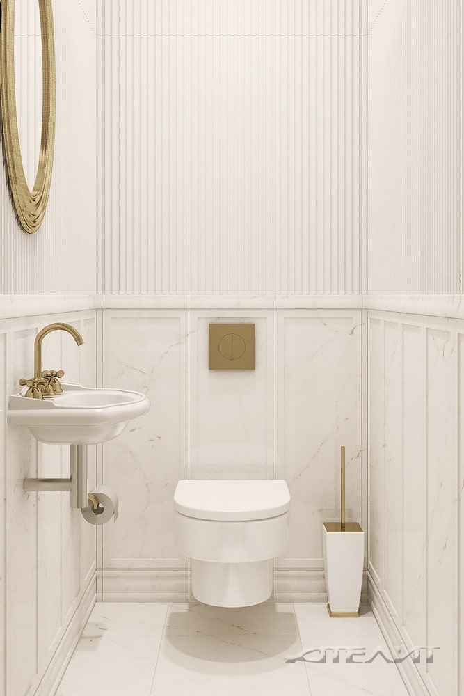Бронзовые аксессуары на фоне белоснежных стен, потолка и пола – интересный и стильный контраст.