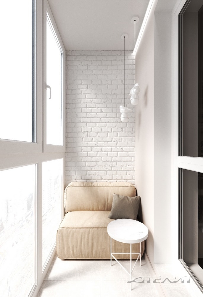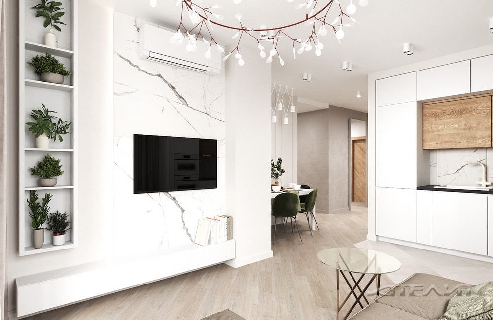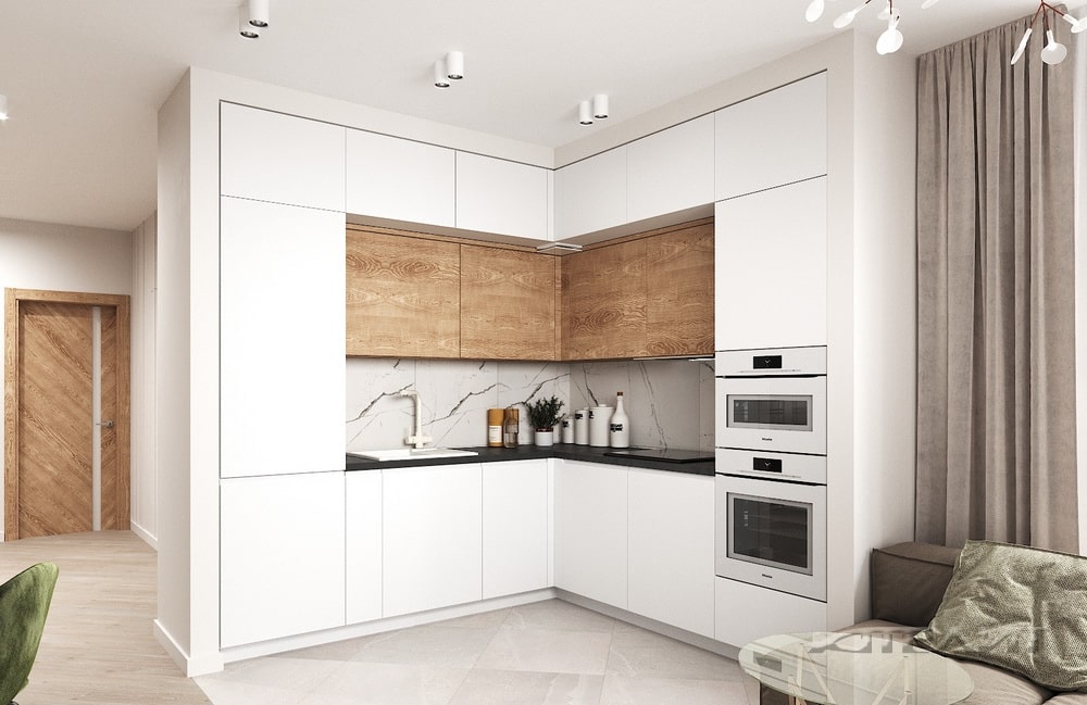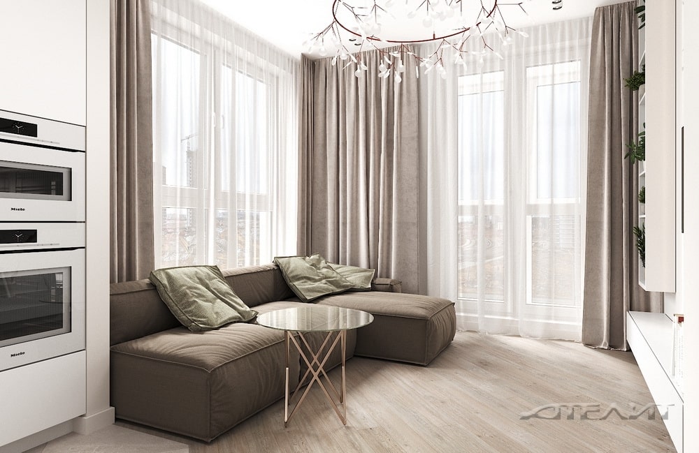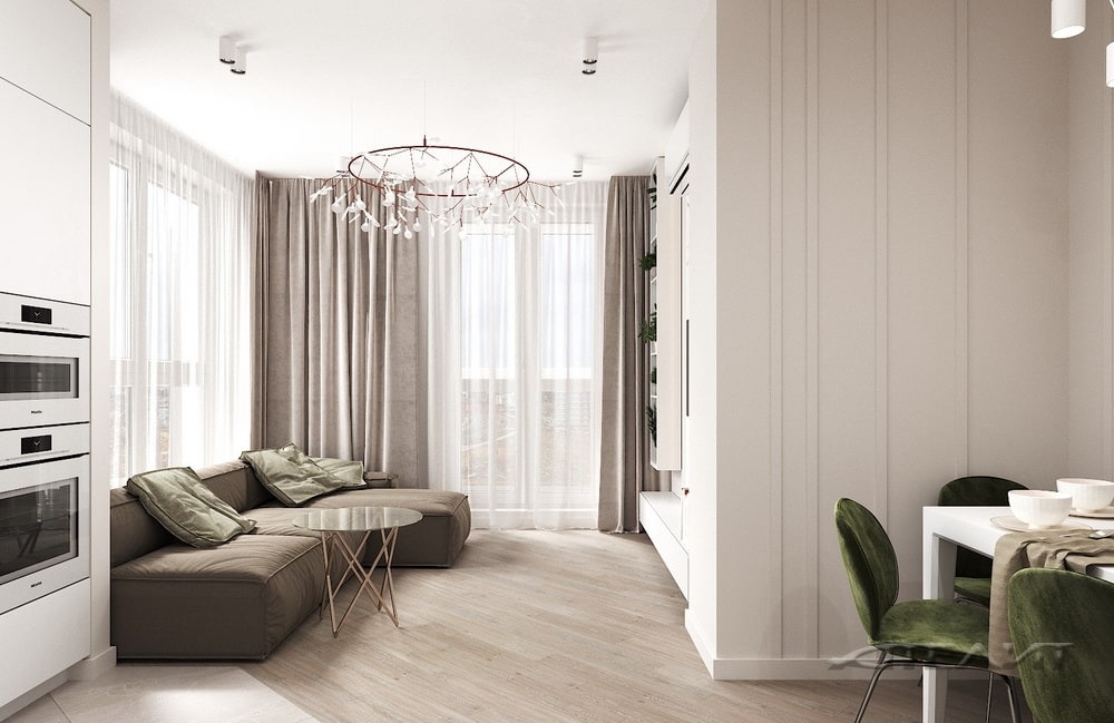 Помещение разделено на две примерно равные части. Для разделения функциональных зон использовано напольное покрытие и потолочное освещение. Вместе с тем, за счет использования близких оттенков, помещение воспринимается как единое целое.