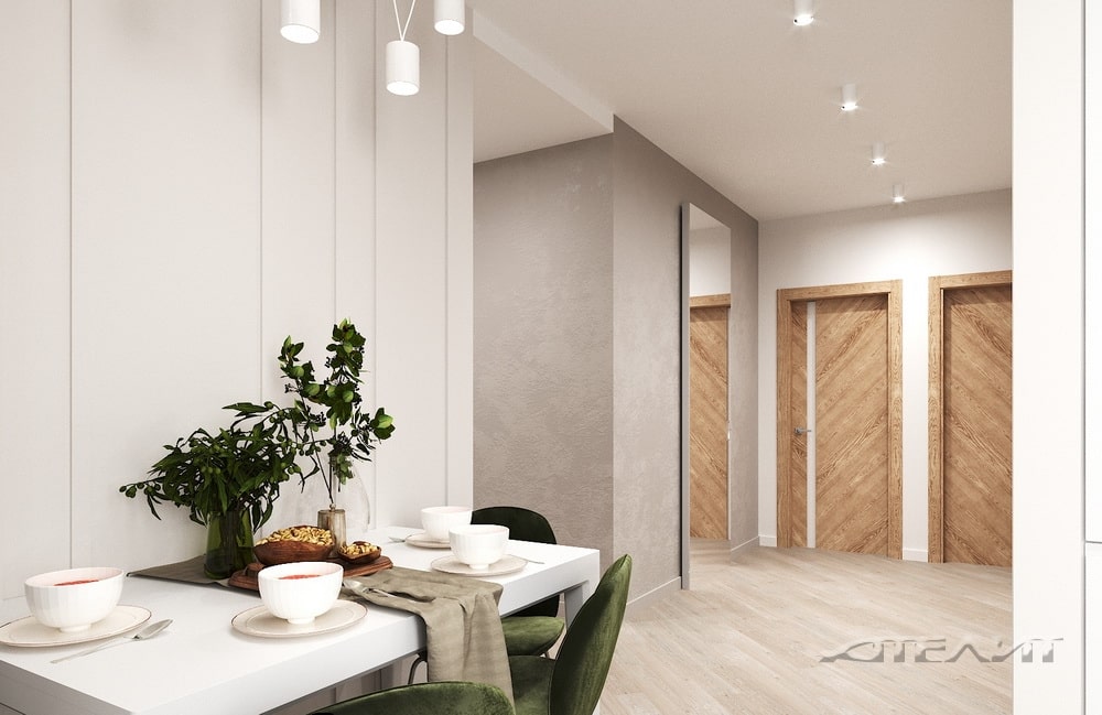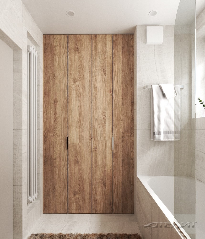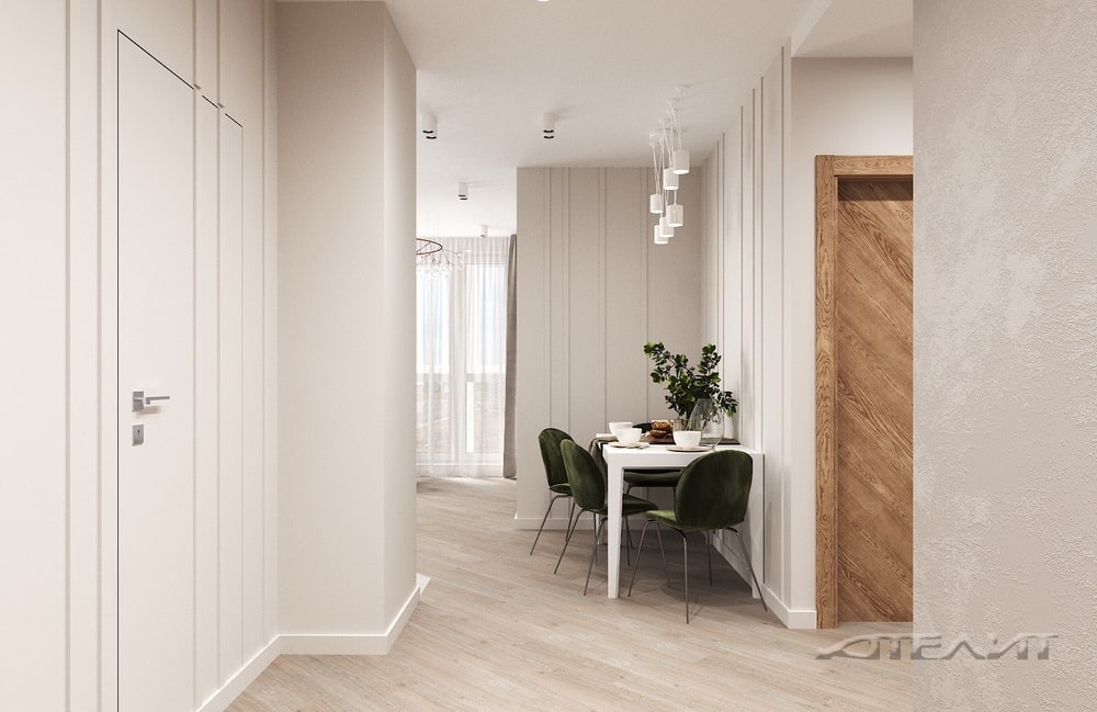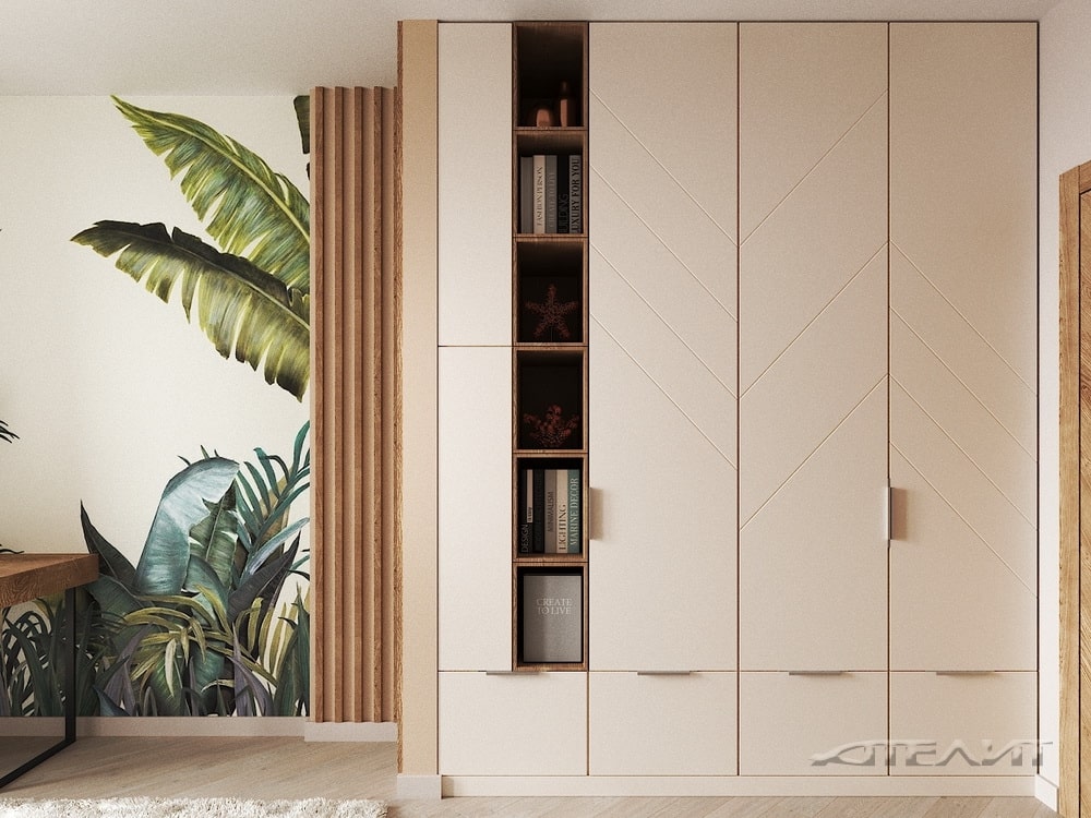 Характерная особенность планировки — миниатюрная прихожая, в которой невозможно разместить достаточно большой шкаф для хранения всей одежды. Поэтому гардеробную перенесли в большой коридор между жилыми комнатами.
