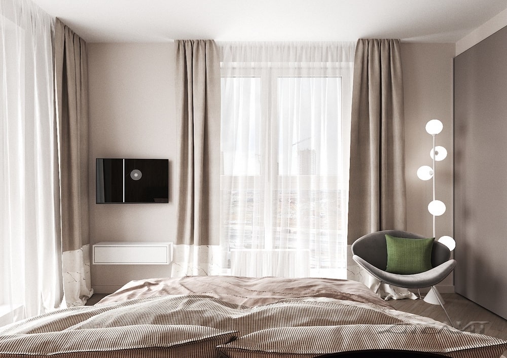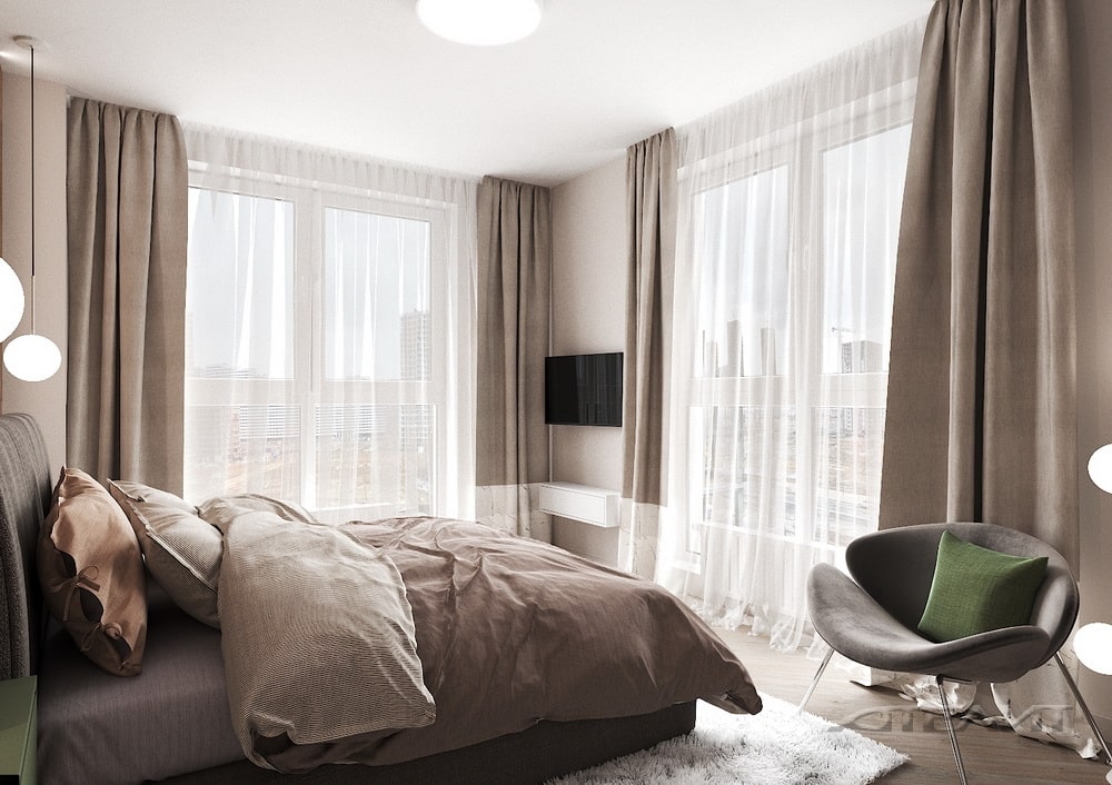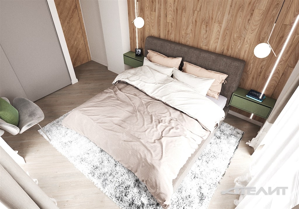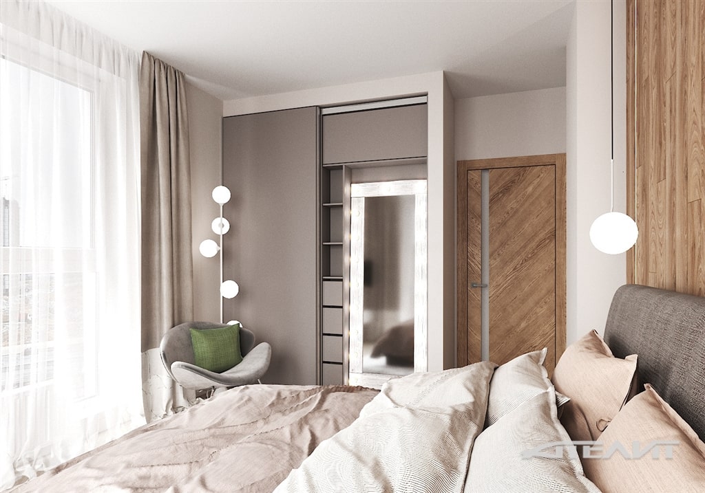 Центральное место в комнате занимает удобная кровать с высоким подголовником. Для хранения вещей предусмотрен встроенный шкаф и дизайнерская тумба. Левая створка встроенного шкафа скрывает театральное зеркало с подсветкой.