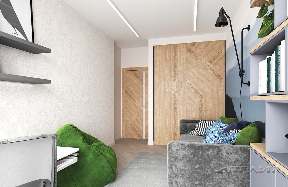 Для хранения вещей предусмотрен стеллаж и встроенный шкаф. В комнате есть все необходимое, для комфортного отдыха и учебы: стол, удобный диван, полки.