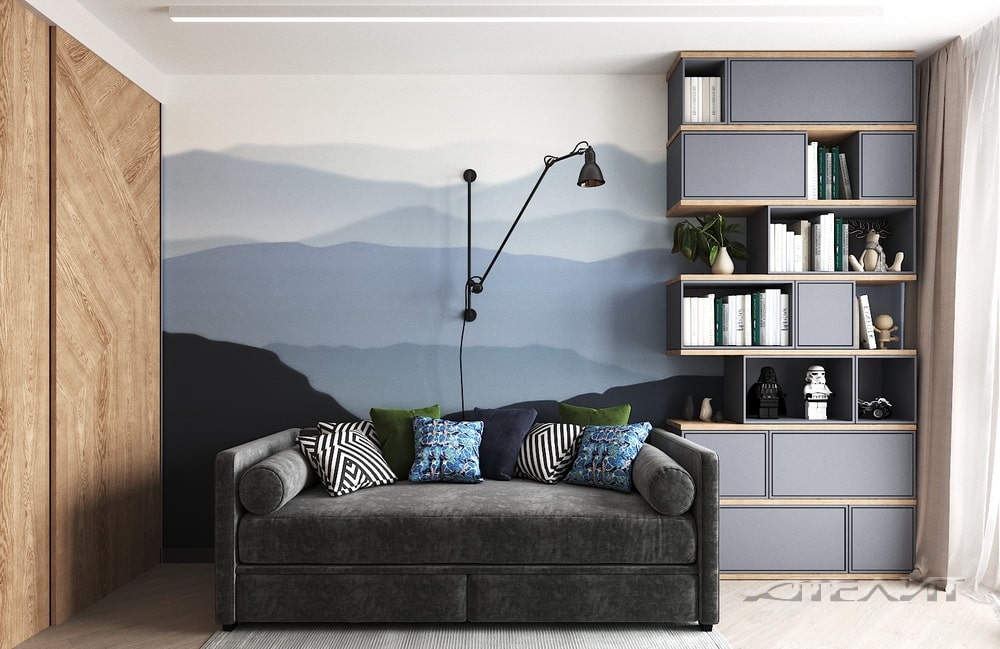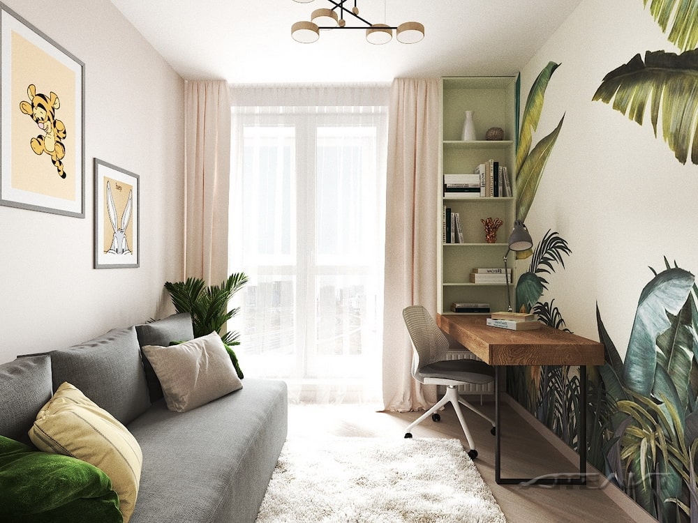 Для выполнения домашних заданий предусмотрено удобное рабочее место. Зона для чтения совмещена с зоной отдыха: при необходимости диван легко превращается в просторное спальное место.
