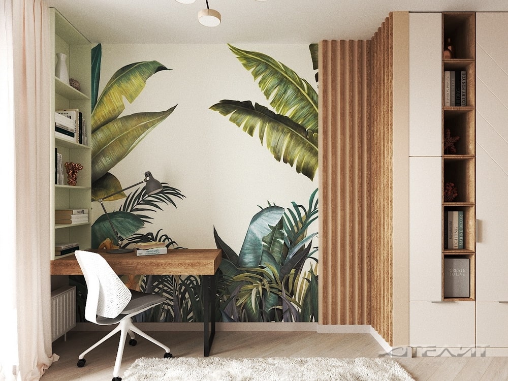 В оформлении преобладают бежевый, кремовый и светло-коричневый цвета с зелеными акцентами.