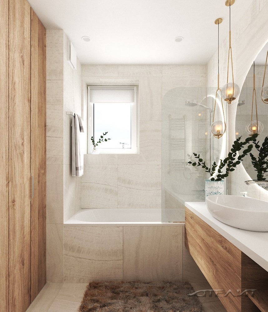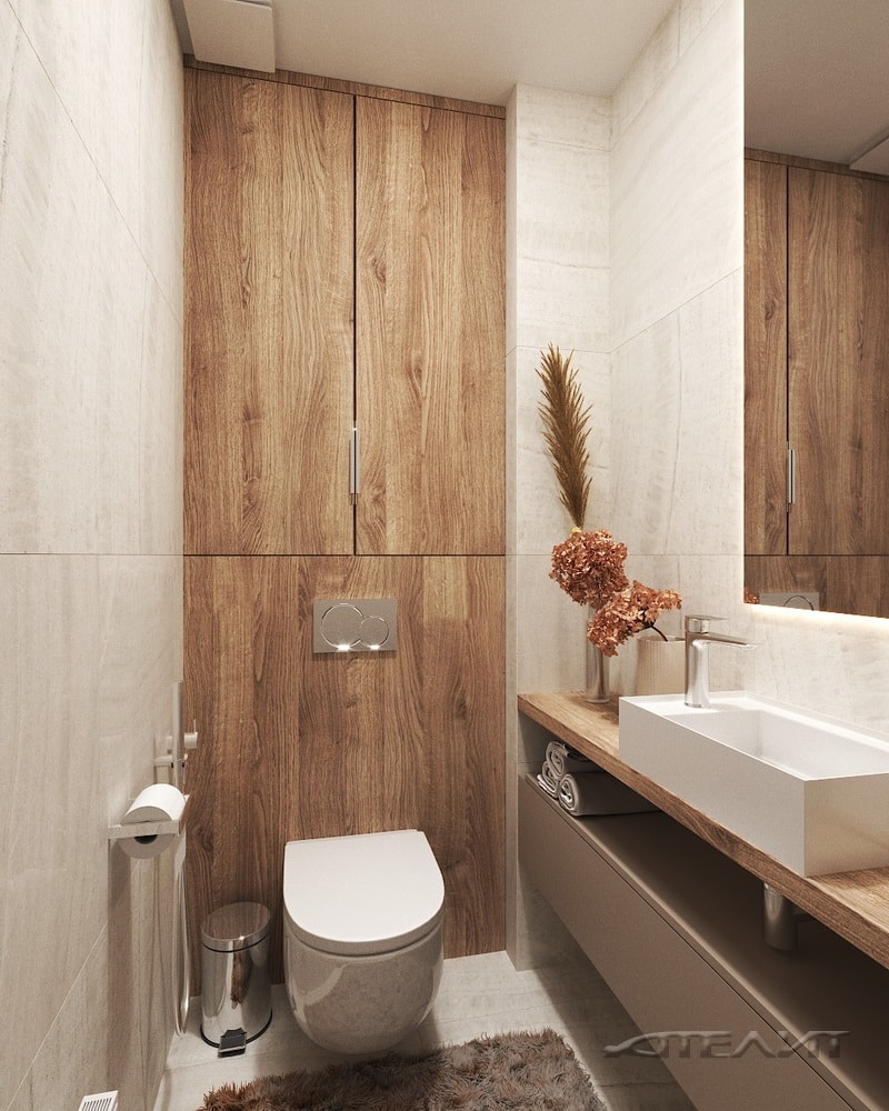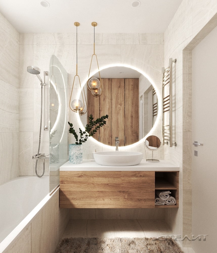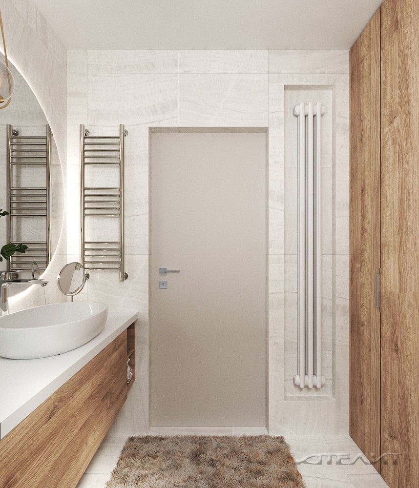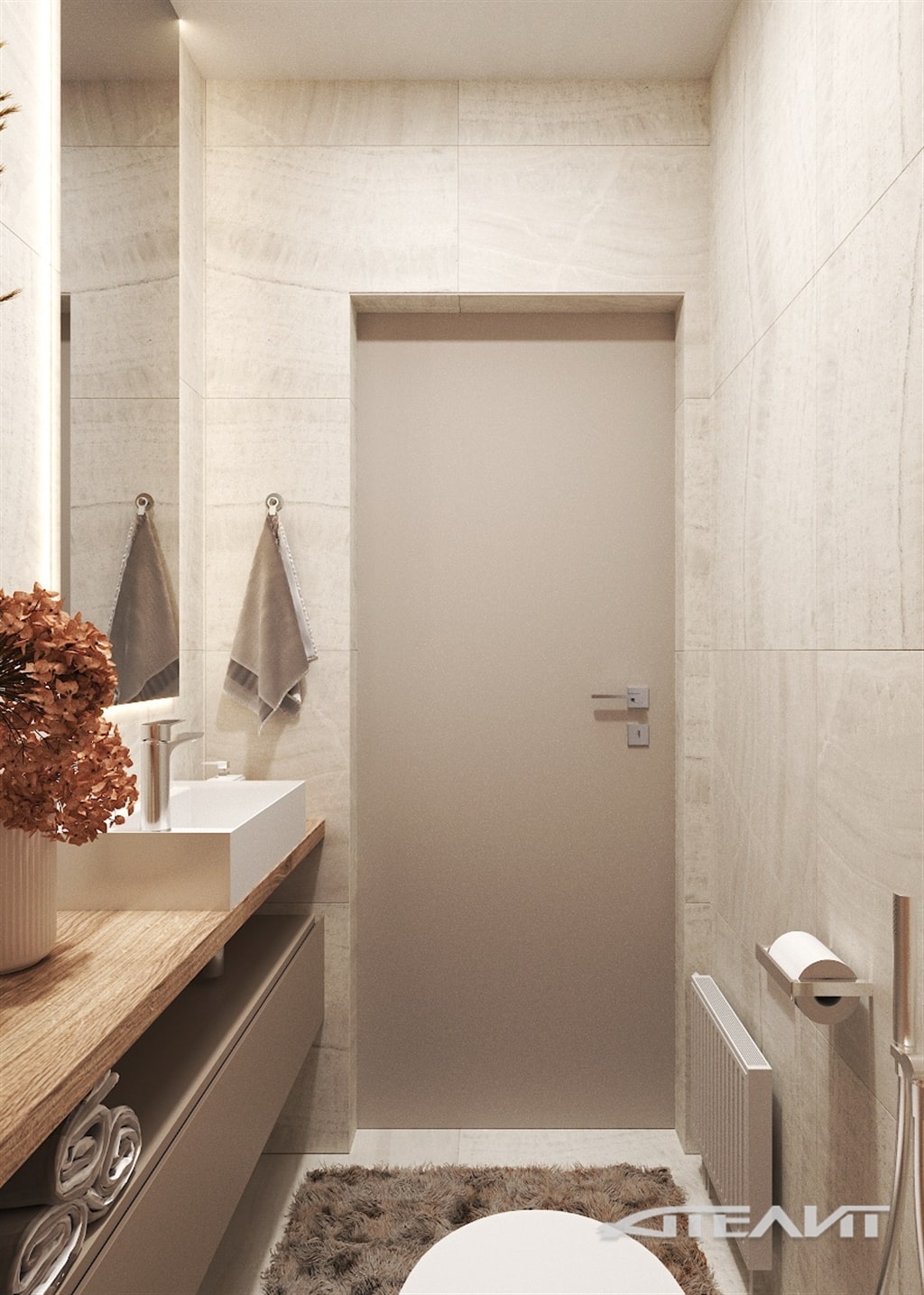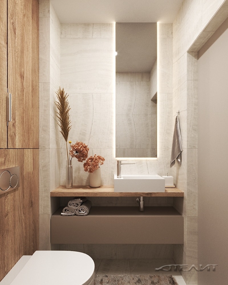 В оформлении использованы современные материалы и элементы под натуральное дерево, что органично дополняет теплый оттенок плитки и сочетается с общей колористикой жилых комнат и ванной.