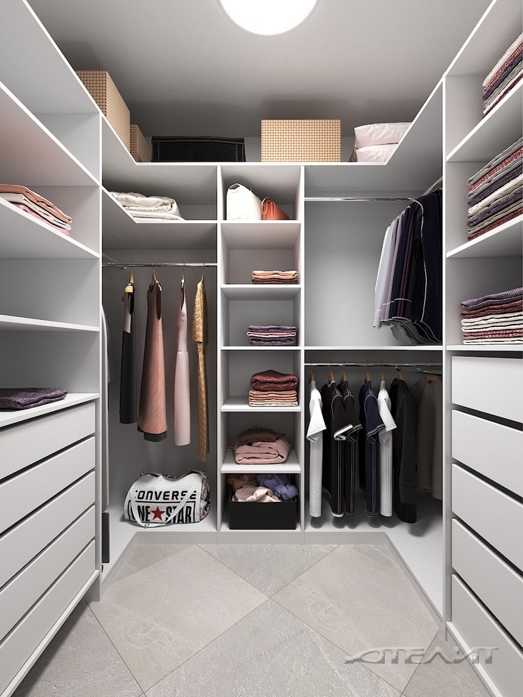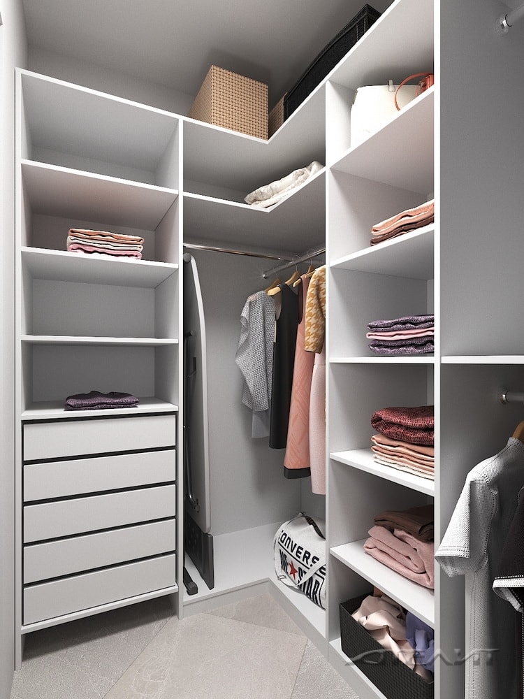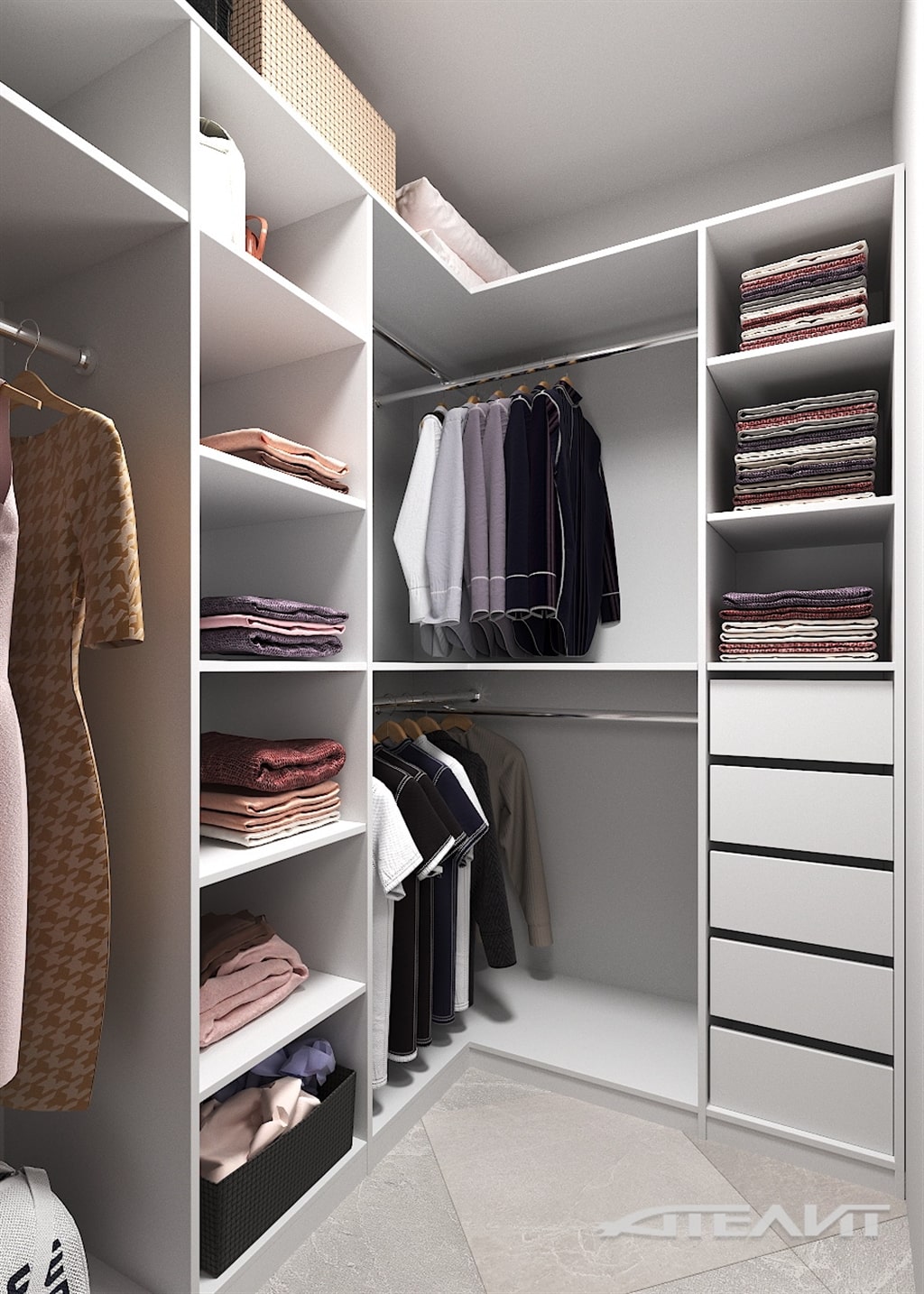 Здесь достаточно места для размещения верхней и сезонной одежды всех членов семьи, а благодаря удобным стеллажам и полкам, ее удобно распределять и сортировать по типу.