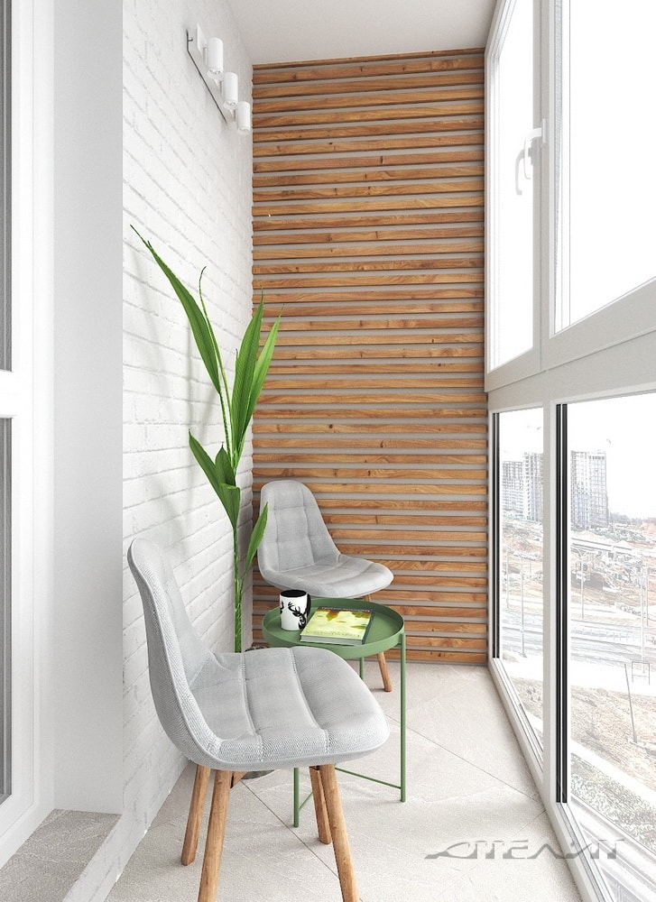По желанию заказчика здесь оборудовано дополнительное жилое пространство с кофейным столиком, удобными стульями и дополнительным освещением для комфортного чтения. Деревянные ламели добавляют уюта и визуально разнообразят лаконичный интерьер ноткой лофта.
