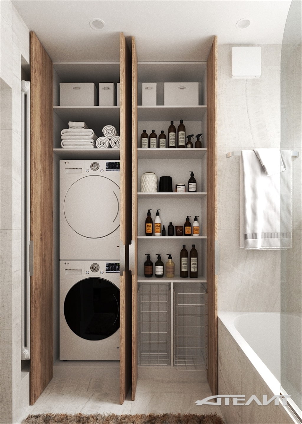 Стиральной машина и сушилка, в целях экономии пространства, установлены в 2 этажа, также размещены полки для косметики.