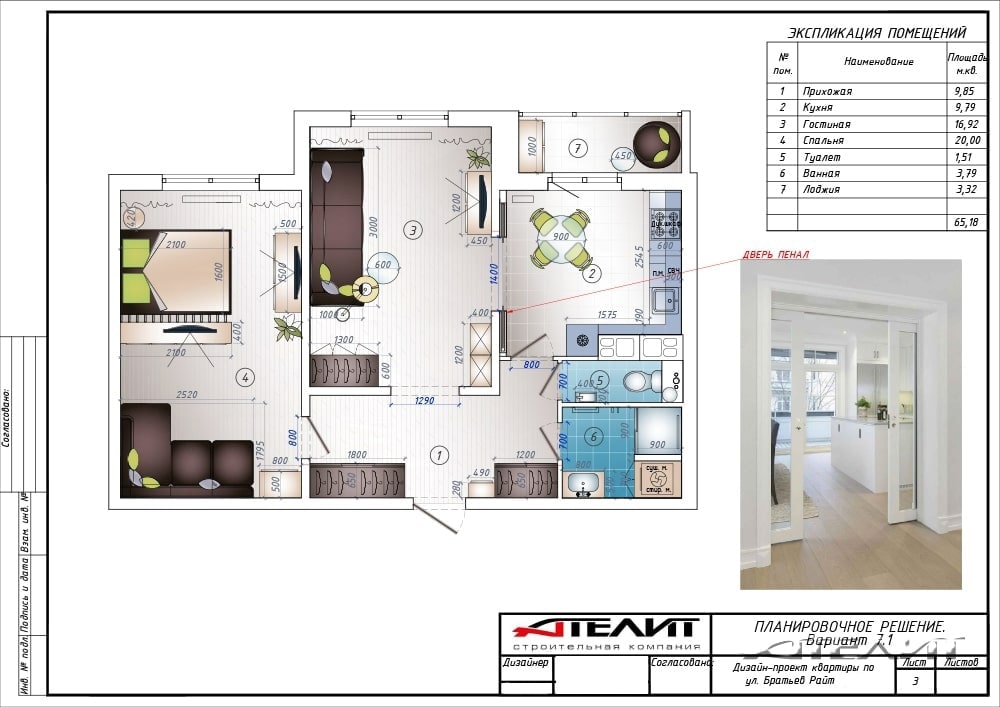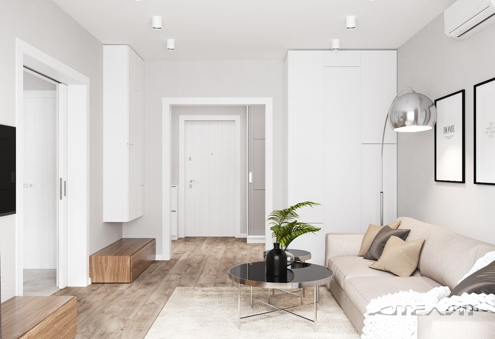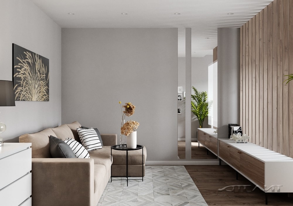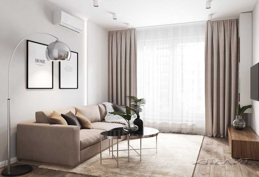 Для разделения функциональных зон гостиную отделили от кухни и прихожей перегородками, в которые встроены раздвижные двери. Это позволило оптимизировать жилое пространство. Хозяева получили возможность при необходимости легко изолировать гостиную от других комнат. Центральное место в помещении занимает зона просмотра ТВ. При необходимости диван легко трансформируется в дополнительное спальное место. В оформлении преобладают бежевый и светло-коричневый цвета, с которыми удачно контрастируют хромированные поверхности журнальных столиков и торшера. Чтобы убрать плохо освещенные участки, дизайнеры добавили потолочное освещение по периметру комнаты и декоративное освещение стены напротив ТВ-зоны. Пол покрыт качественным ламинатом под натуральное дерево, который хорошо сочетается со стеллажами. Для хранения вещей предусмотрен шкаф и настенный стеллаж. Они оформлены в светлых тонах, поэтому зрительно не загромождают обстановку.