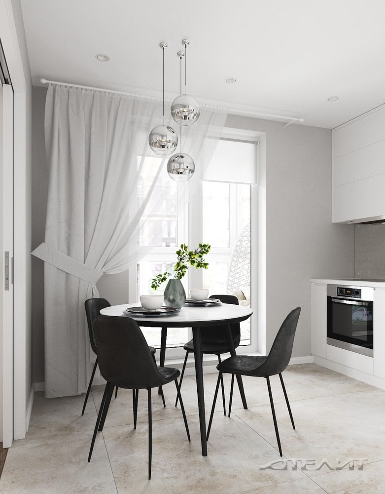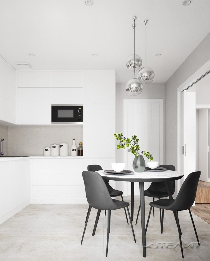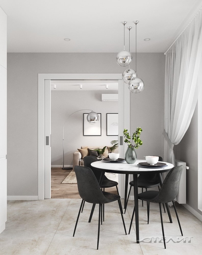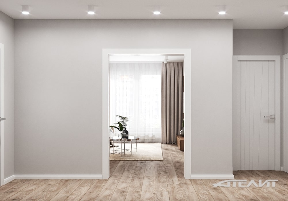 Интерьер выполнен в современном лаконичном стиле. В оформлении использован белый цвет, а также спокойные оттенки бежевого, светло-коричневого и серого цветов, которые удачно дополнены деревом. Легкие перегородки изящно разделяют функциональные зоны. Заказчик остался доволен реализацией проекта.