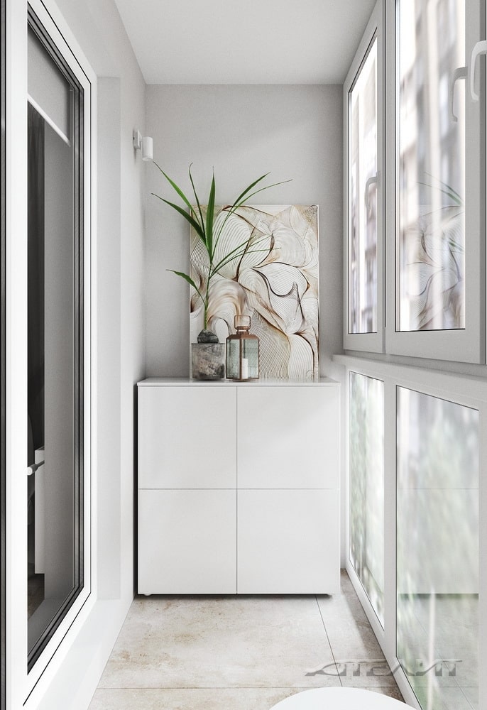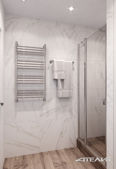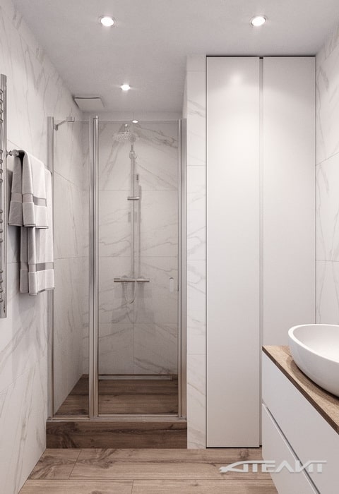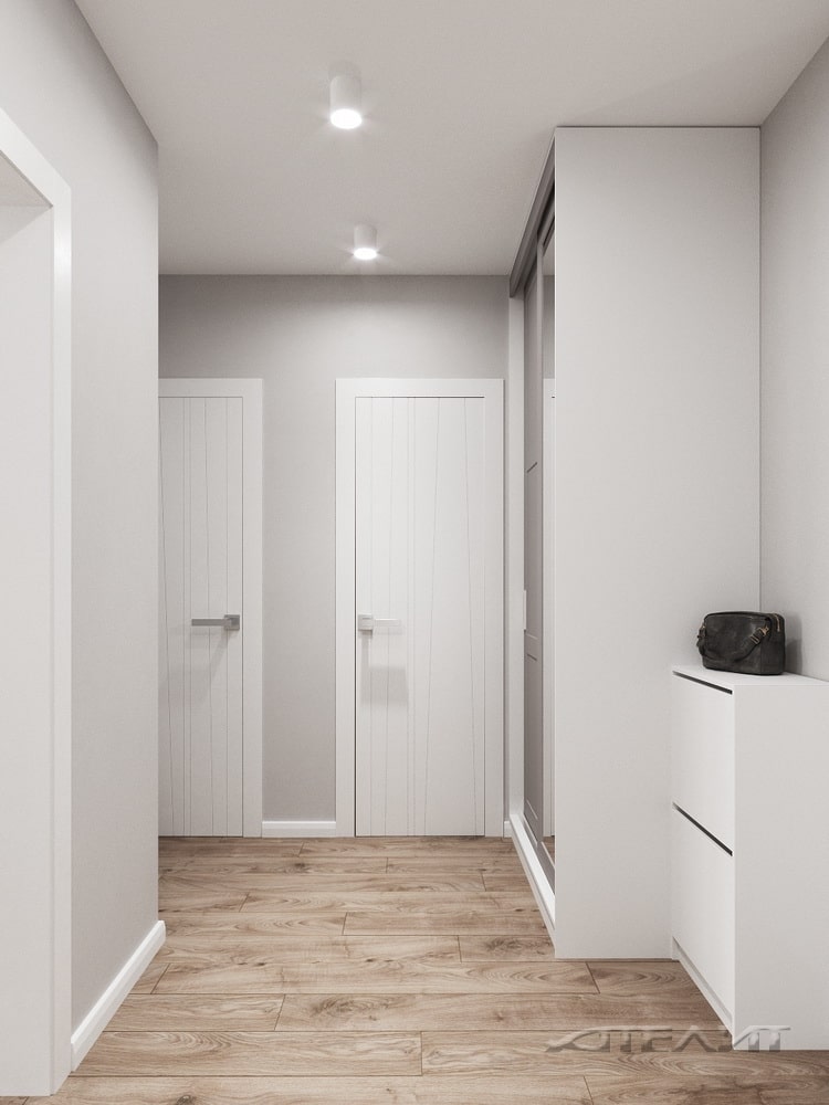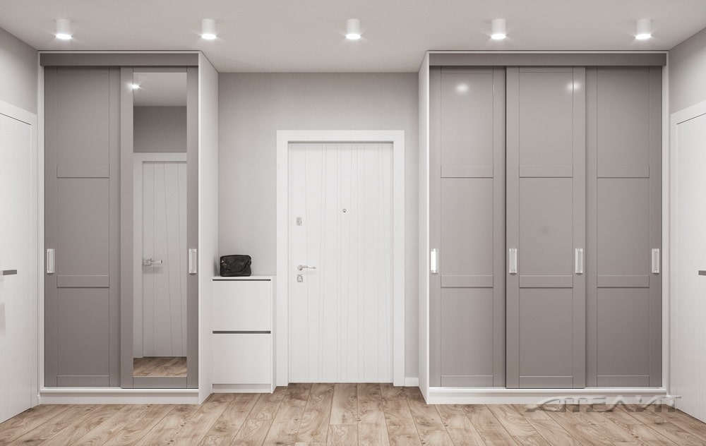 В компактном помещении удалось разместить два встроенных шкафа, благодаря чему хозяева получили возможность хранить здесь больше вещей и освободить больше пространства жилых комнат. Зеркальные фасады, помимо утилитарной функции, зрительно расширяют пространство и делают помещение светлее.