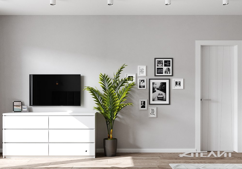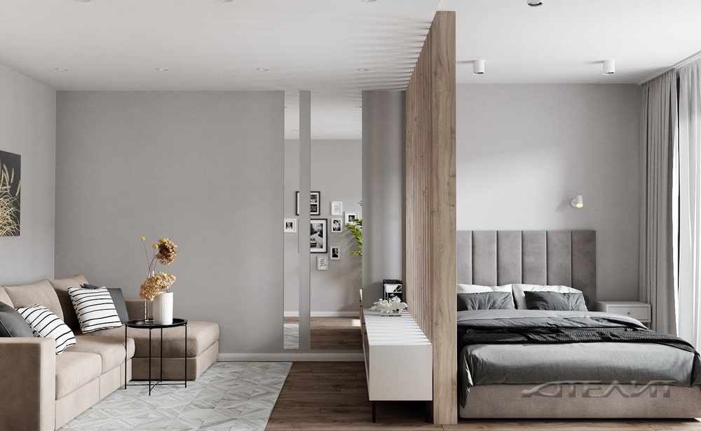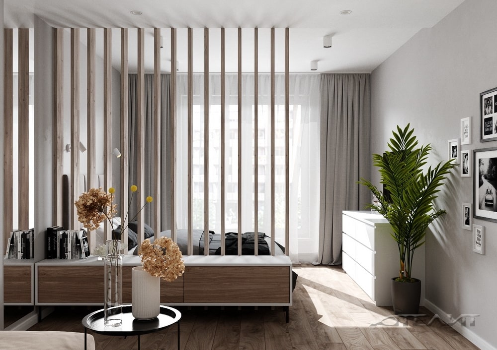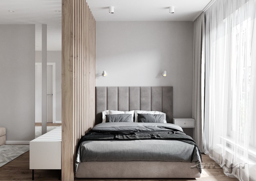 При оформлении дизайнеры опирались на сочетание мягких бежевых, светло-коричневых и серых оттенков, потому что оно создает спокойную атмосферу. Деревянные ламели образуют дизайнерскую перегородку между зоной отдыха и зоной чтения. Комод, стеллаж для книг и тумба под телевизор, по аналогии с мебелью в гостиной, оформлены в белом цвете, чтобы зрительно не перегружать обстановку.
