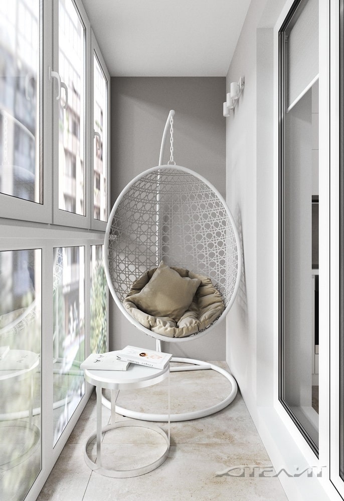 По согласованию с заказчиками, здесь оборудовали продолжение жилого пространства, которое совмещает в себе функциональность зоны отдыха и зоны для чтения. Подвесное садовое кресло белого цвета прекрасно дополняет в существующий интерьер.