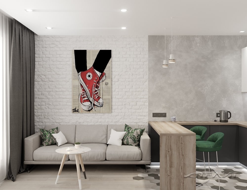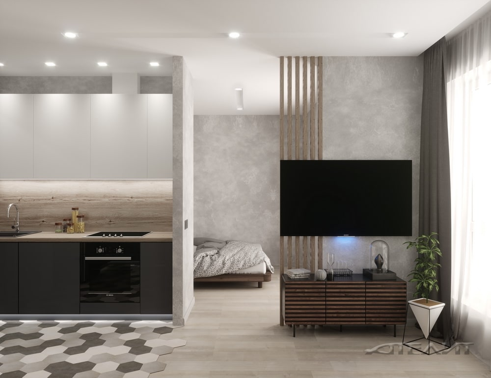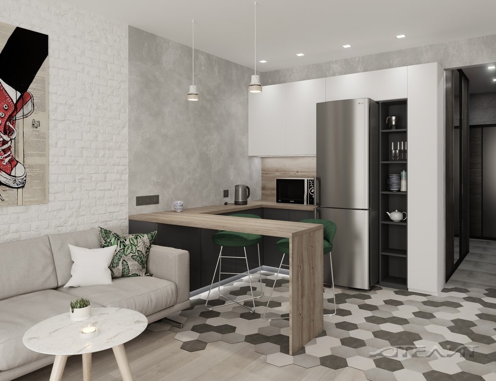 Между гостиной и кухней установлена компактная барная стойка. Дополнительное зонирование выполнено при помощи напольного покрытия и встроенного потолочного освещения. Зона отдыха частично отделена перегородкой, в которой разместились рабочие панели и раковина. Пол покрыт декоративным ламинатом в виде шестиугольных сегментов коричневого и бежевого цветов. Рабочие панели и барная стойка выполнены из материала, который имитирует натуральную древесину и перекликается по цвету с полом в остальной квартире, добавляя в жилое пространство больше тепла.
