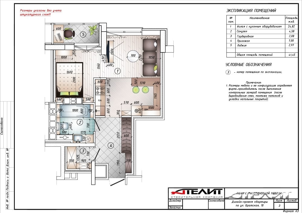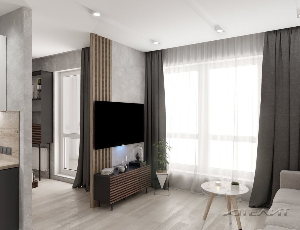 Задача: Обустроить современную удобную квартиру для молодой семьи. Создать комфортное жилое пространство, объединяющее в себе кухню, гостиную и место для отдыха, разделив функциональные зоны с помощью грамотных интерьерных решений. Превратить балкон в рабочий кабинет и создать вместительную гардеробную.
