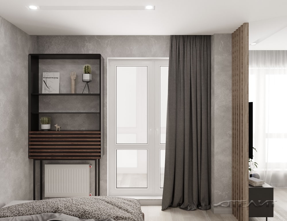 Зона отдыха находится за кухонной перегородкой. Дизайнеры добавили еще одну перегородку с декоративной вставкой из деревянных панелей, которая, с одной стороны, позволила сделать зону отдыха уютнее, а с другой — стала удобным местом для крепления телевизора. В зоне отдыха находится удобная двуспальная кровать. Для хранения постельных принадлежностей предусмотрен вместительный встроенный шкаф. В качестве акцентного элемента использованы часы с декоративным циферблатом над изголовьем кровати.