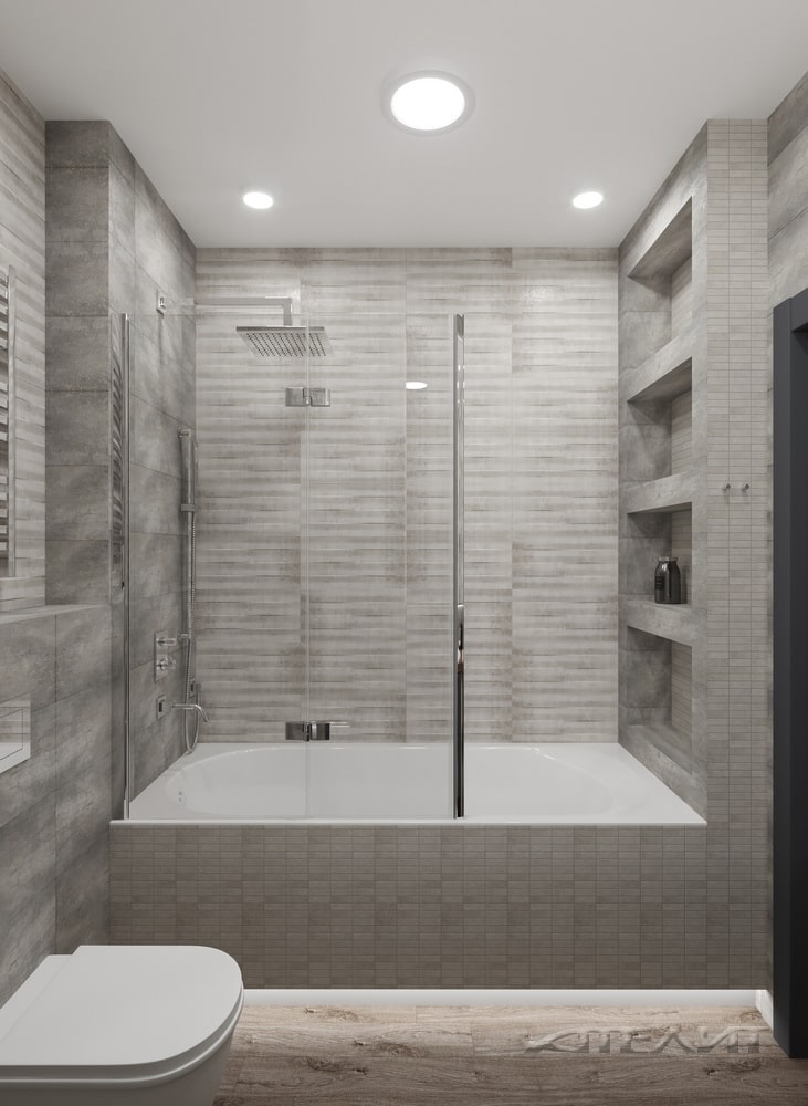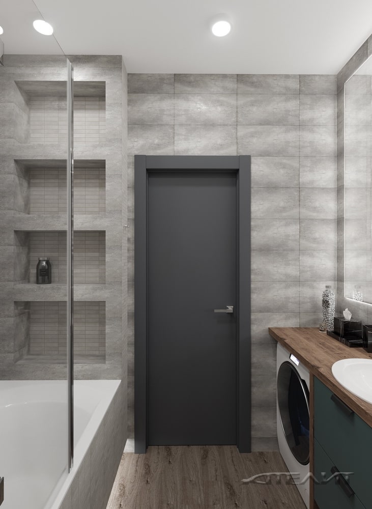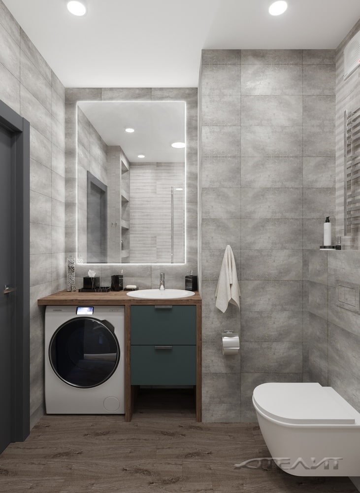 Стильно, удобно и функционально — именно так характеризуется реализованное решение в санузле в проекте «Квартира на Братской, 10». Цветовое решение перекликается с гаммой интерьера остальных помещений («молочный шоколад»), но немного темнее. Несмотря на небольшую площадь, здесь удалось разместить, все что нужно для удобного проживания, включая полноразмерную ванну, раковину и современную стиральную машину. Акцентными элементами служат монохромная дверь и крупное зеркало с обратной подсветкой.