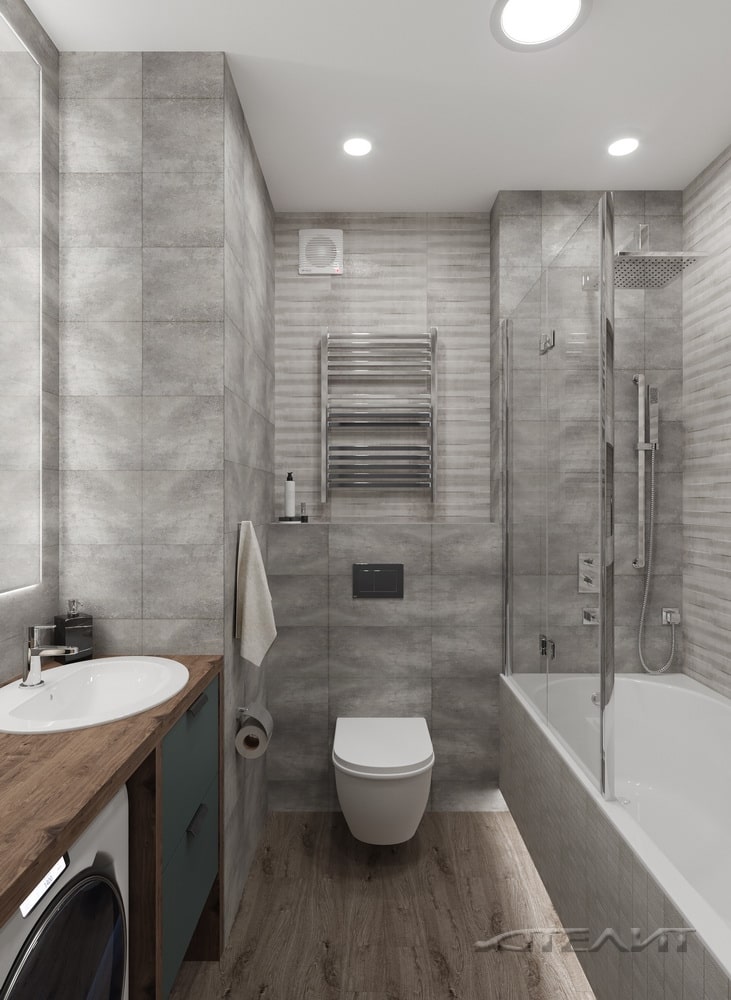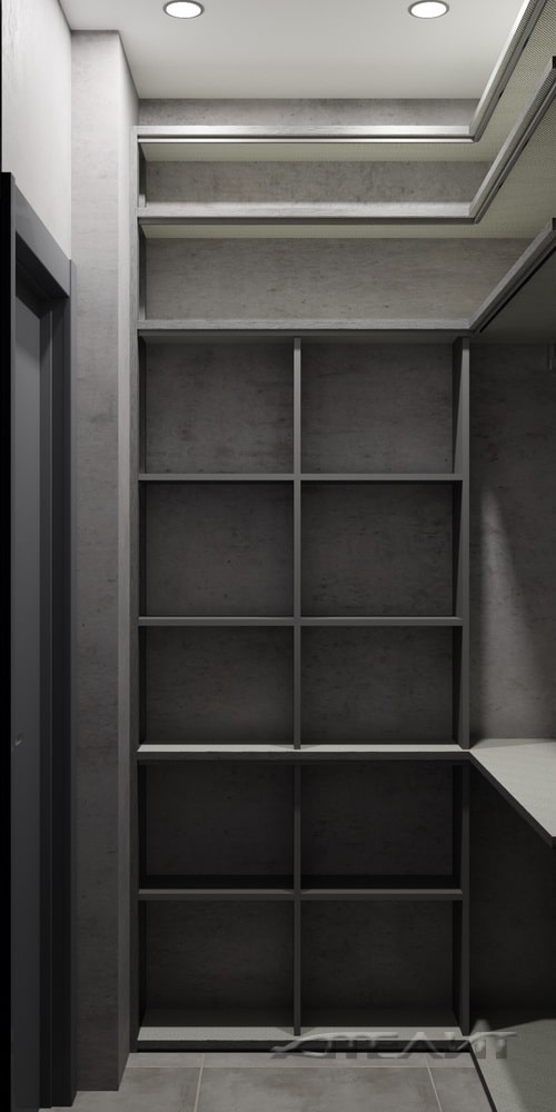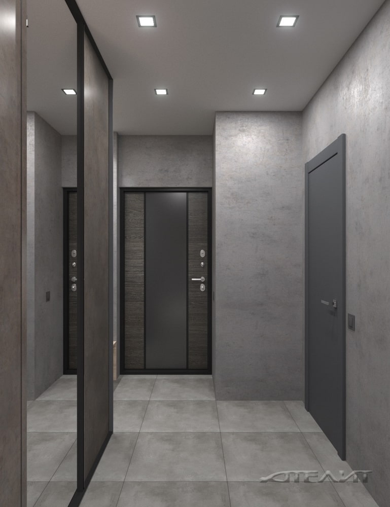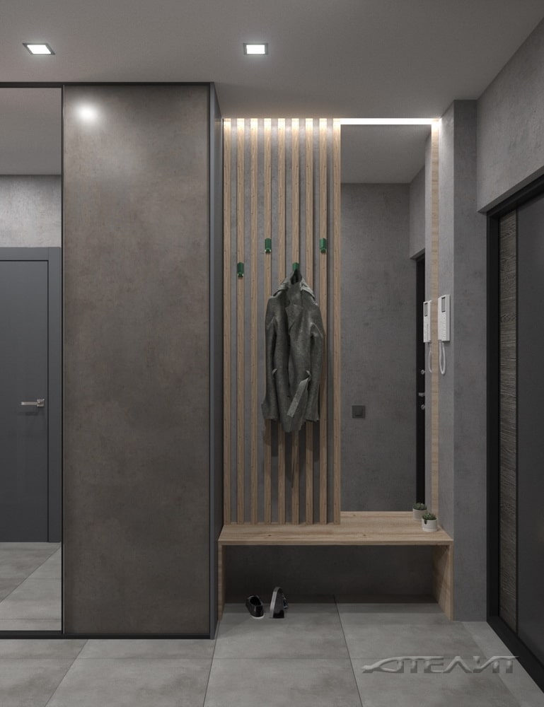 Цветовое оформление прихожей одновременно перекликается и с жилой зоной, и с санузлом. Для хранения верхней одежды предусмотрен вместительный шкаф со штангами для вешалок и встроенным зеркалом в полный рост.
