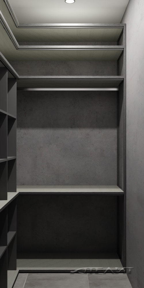Одним из требований заказчиков был вместительный гардероб, поэтому дизайнеры отвели под него отдельное помещение, в котором разместились удобная встроенная мебель для хранения одежды, обуви и аксессуаров.
