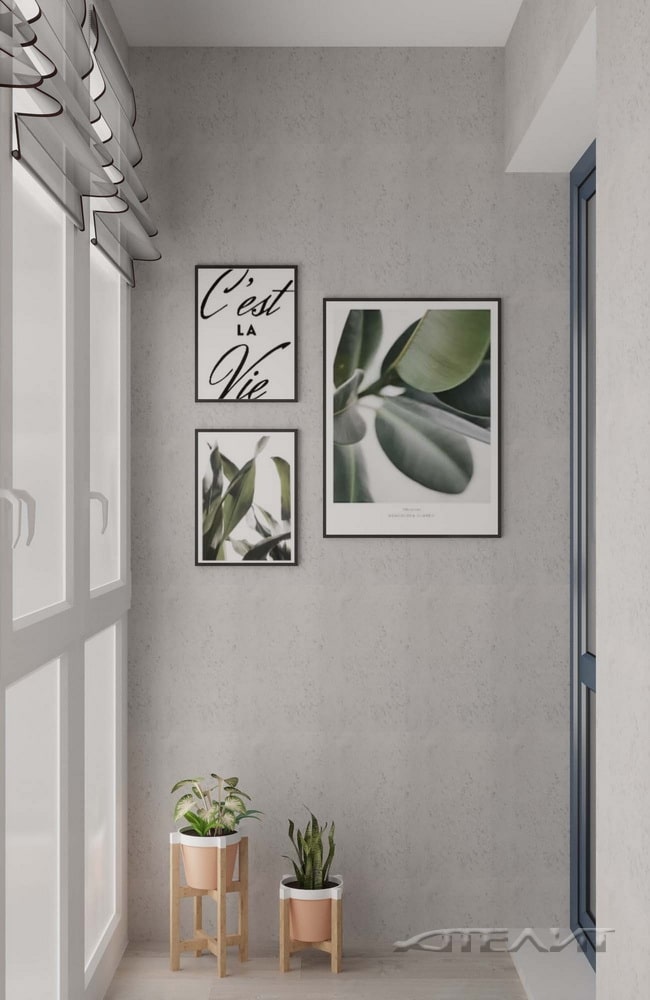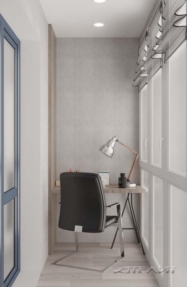 В целях экономии жилого пространства балкон со французским остеклением переоборудовали в удобную рабочую зону и установили здесь компактный столик.