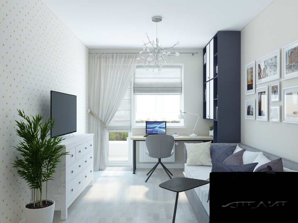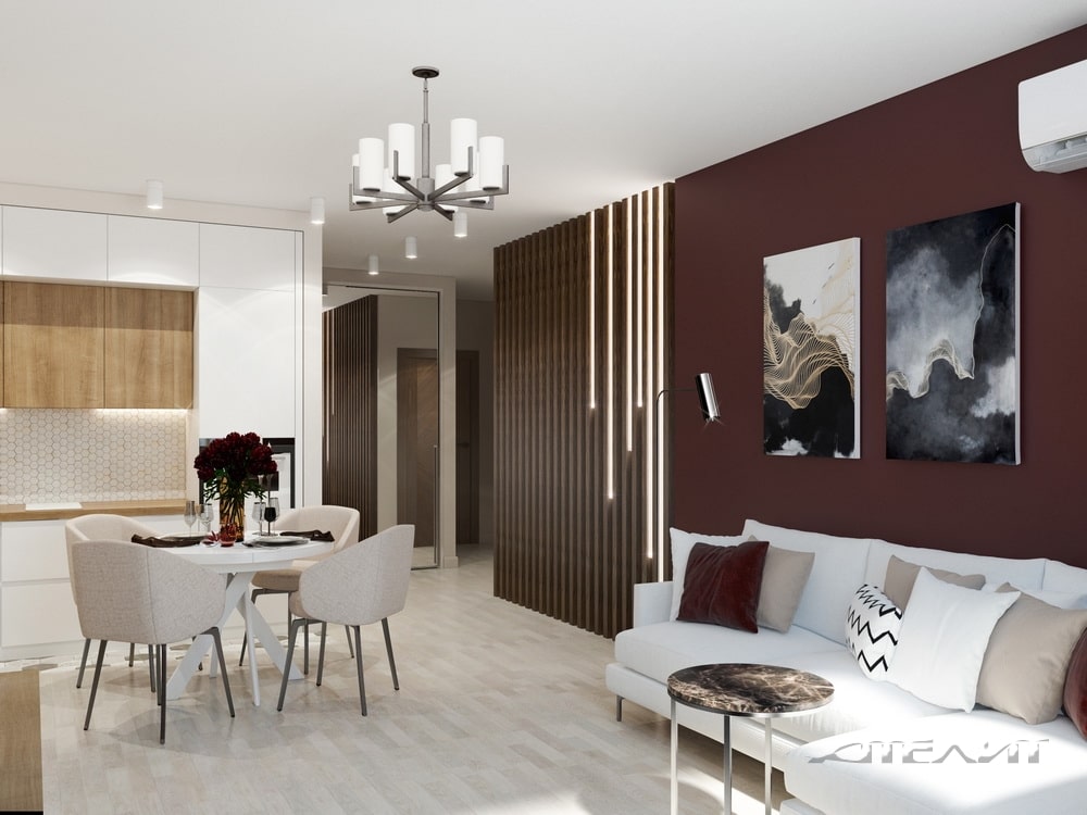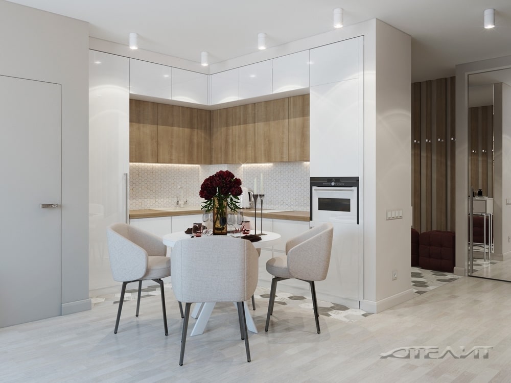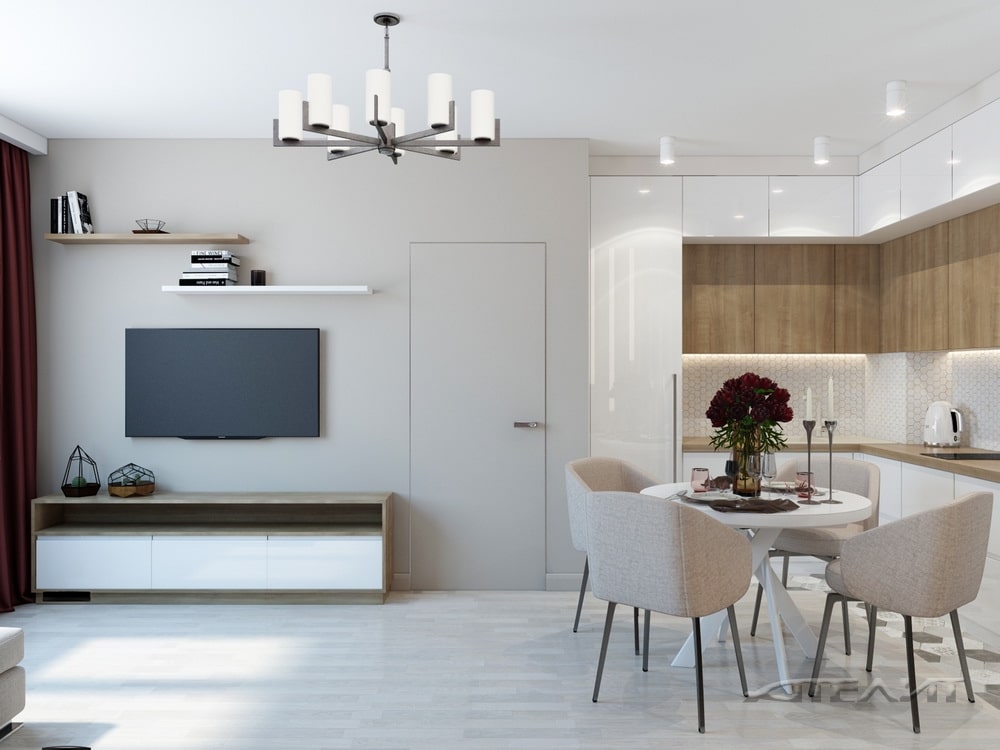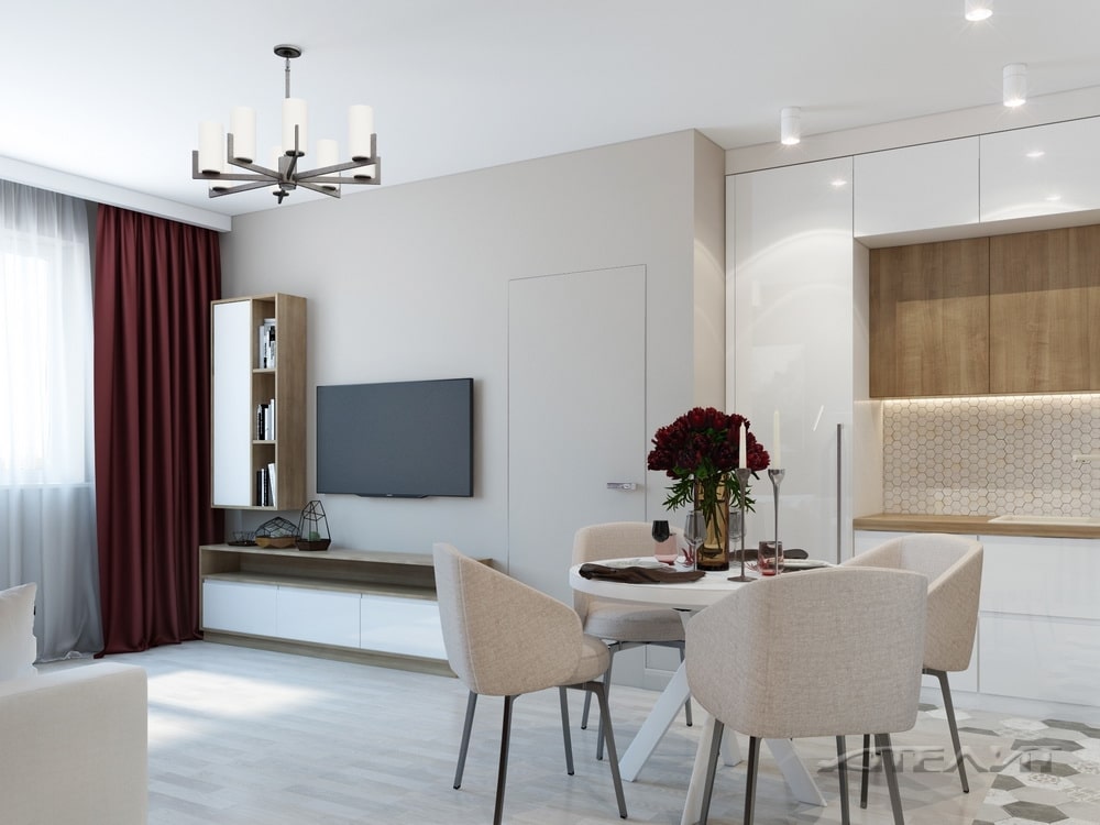Для оптимизации пространства небольших помещений гостиную и кухню объединили. Необходимые зоны выделили с помощью соответствующей расстановки мебели, использования цветовых акцентов.