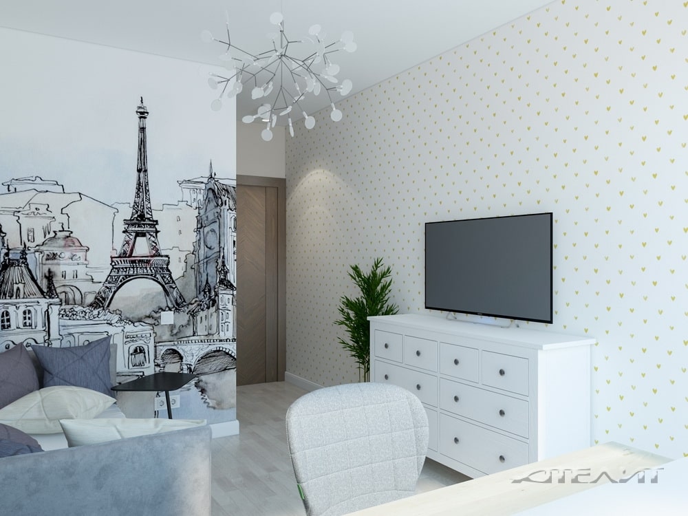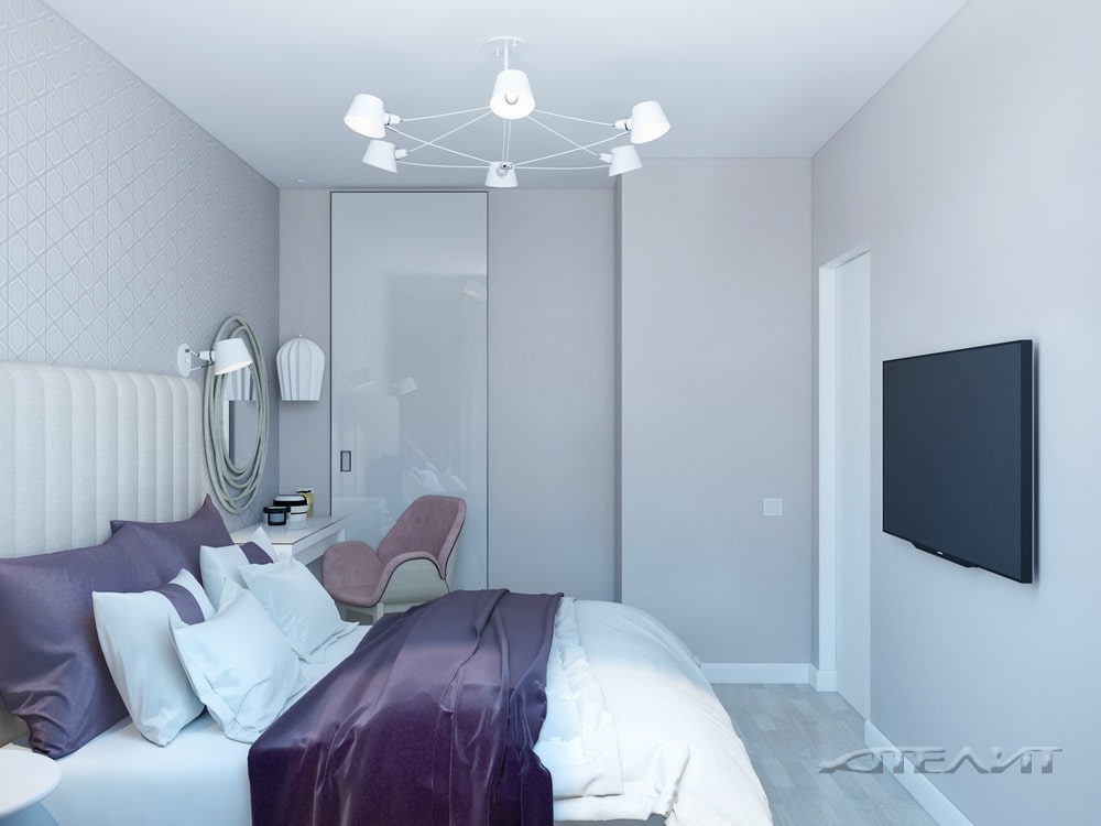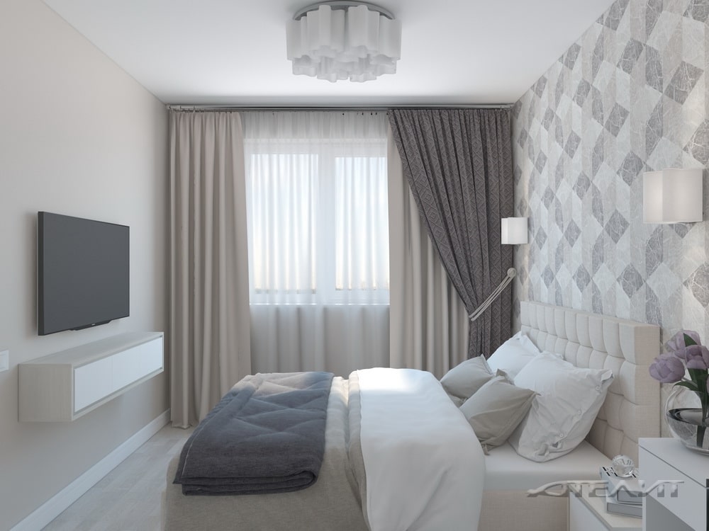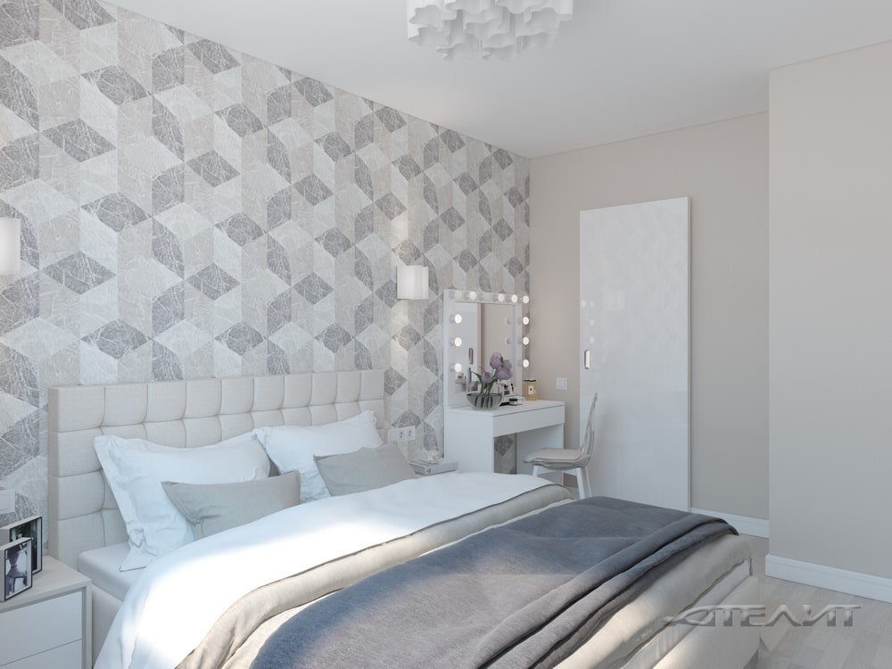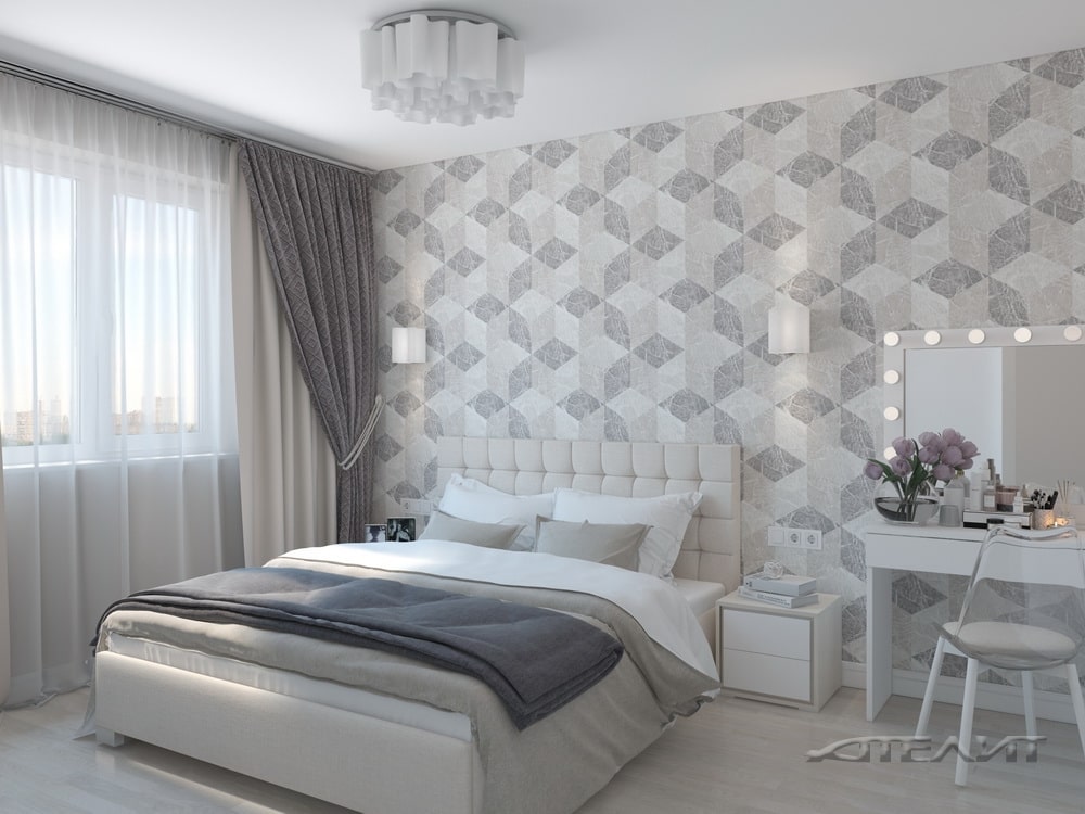 Светлые тона с легкими серыми акцентами погружают в состояние покоя, а это самое главное качество для комнаты сна и отдыха.