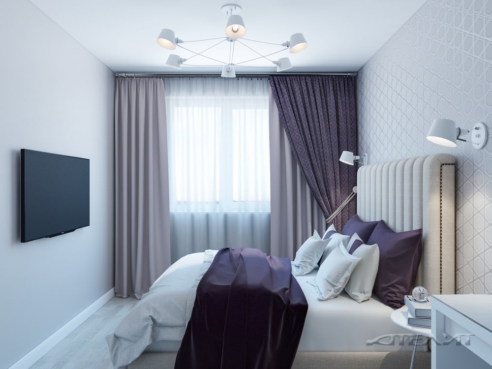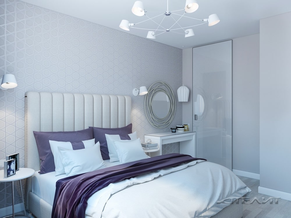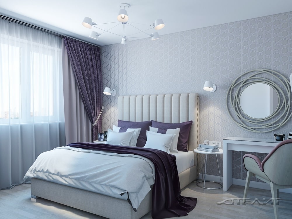 Эффектные лиловые акценты придают спальне легкую изюминку.