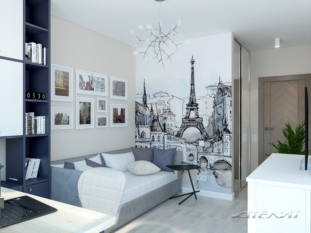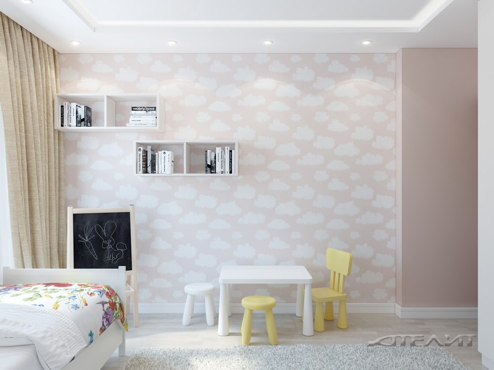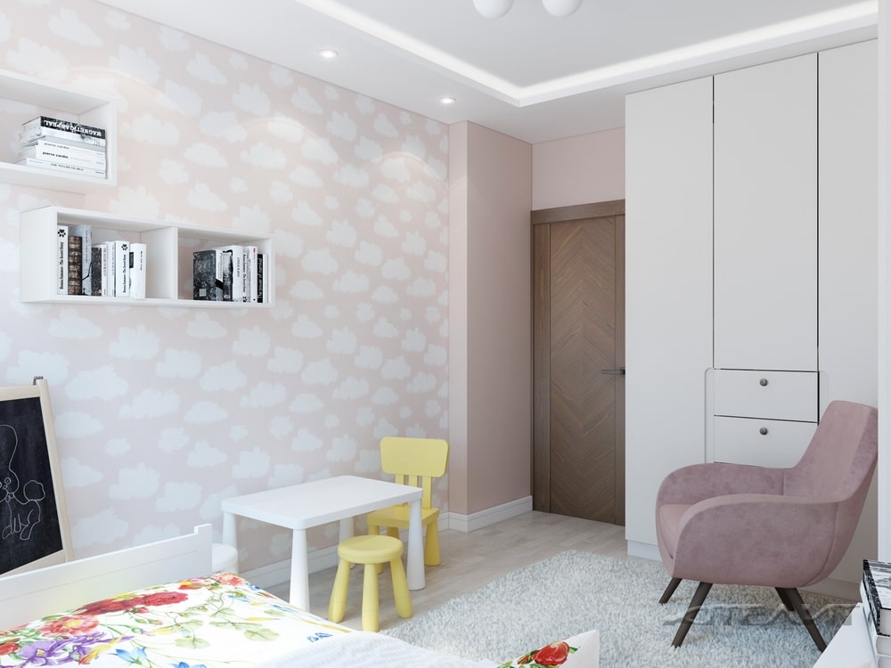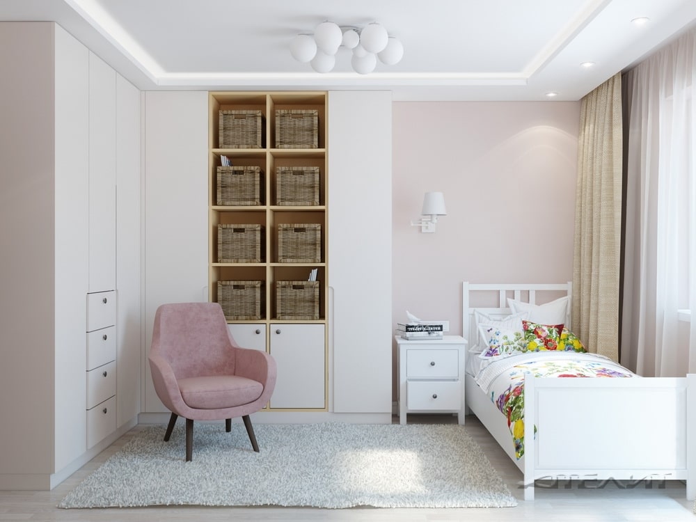 Комната для ребенка постарше также оформлена с учетом всех необходимых потребностей. Предусмотрены зоны для занятий, отдыха, хранения вещей.