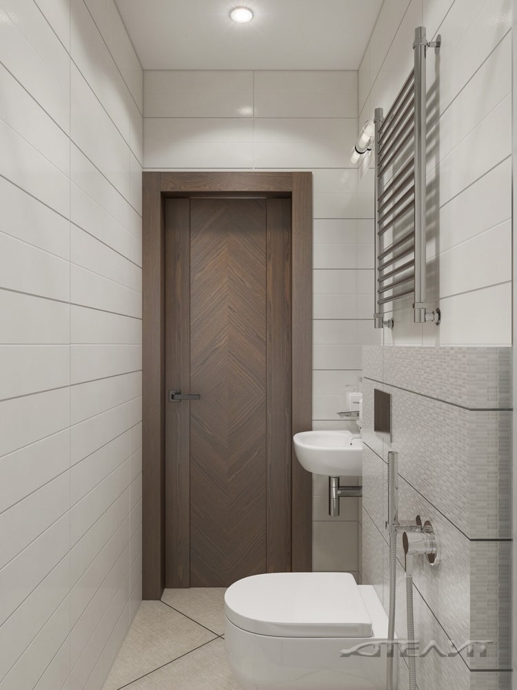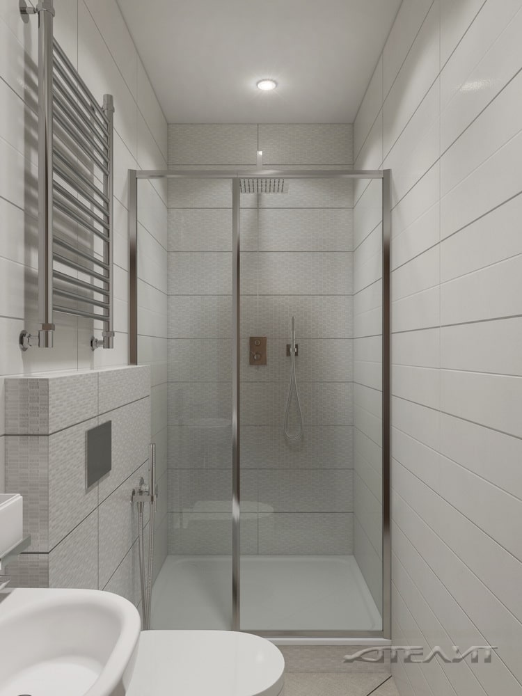 Для экономии места установлена душевая кабина, лаконичная светлая плитка визуально увеличивает пространство небольшого помещения.