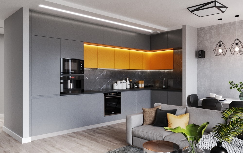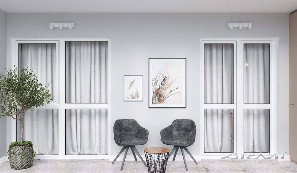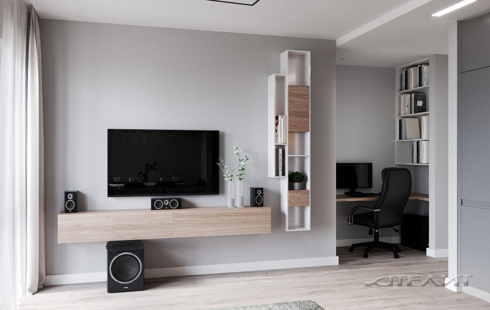 Помещение оформлено в спокойных тонах (светло серый, бежевый, тускло-бирюзовый), что способствует расслаблению. Роль акцентных элементов досталась кухонным стульям, дизайнерским светильникам, журнальному столику с растениями и мощной аудиосистеме. Зона готовки визуально отделена потолочным освещением и небольшой перегородкой. Благодаря большим окнам, жильцы не будут испытывать недостатка в естественном свете.