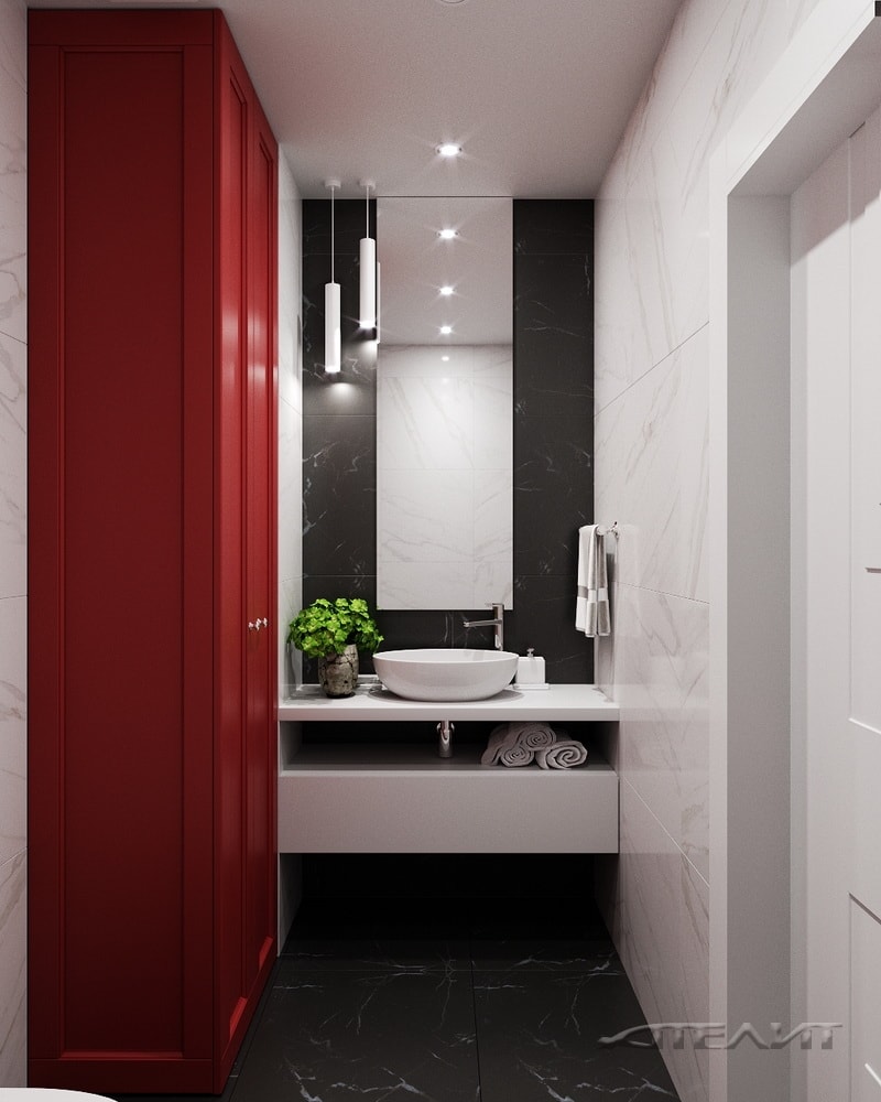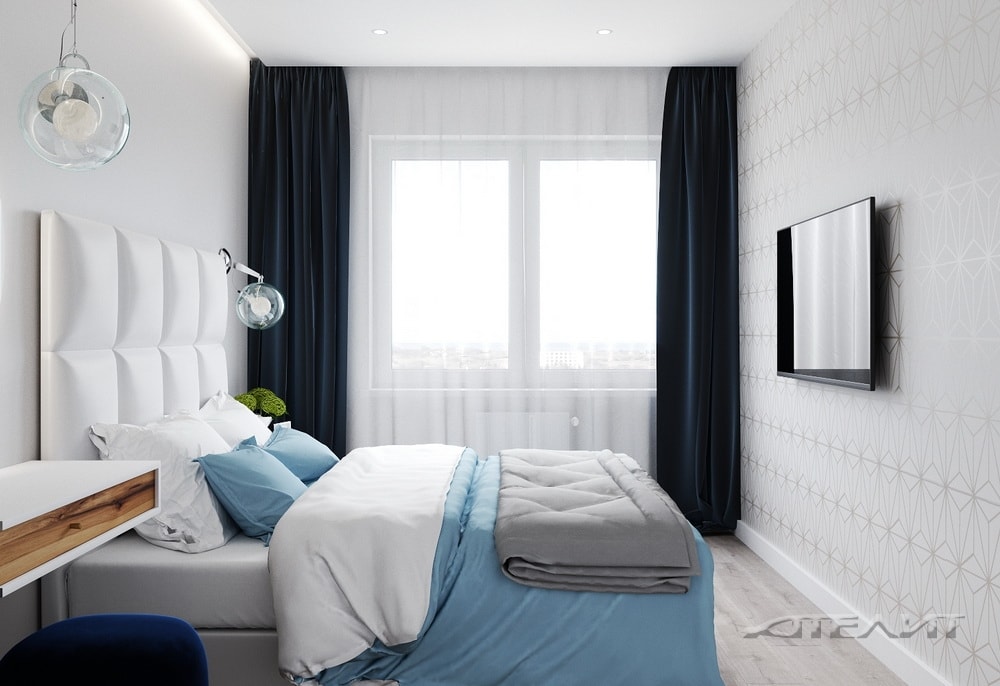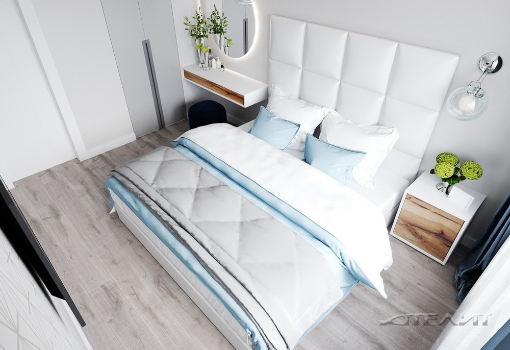 Преобладающий принцип оформления — контраст белого и разных оттенков бирюзового. Потолочное освещение, бра и театральное зеркало позволяют легко подобрать комфортное освещение. Из-за ограниченного пространства зона отдыха здесь совмещена с зоной просмотра ТВ.