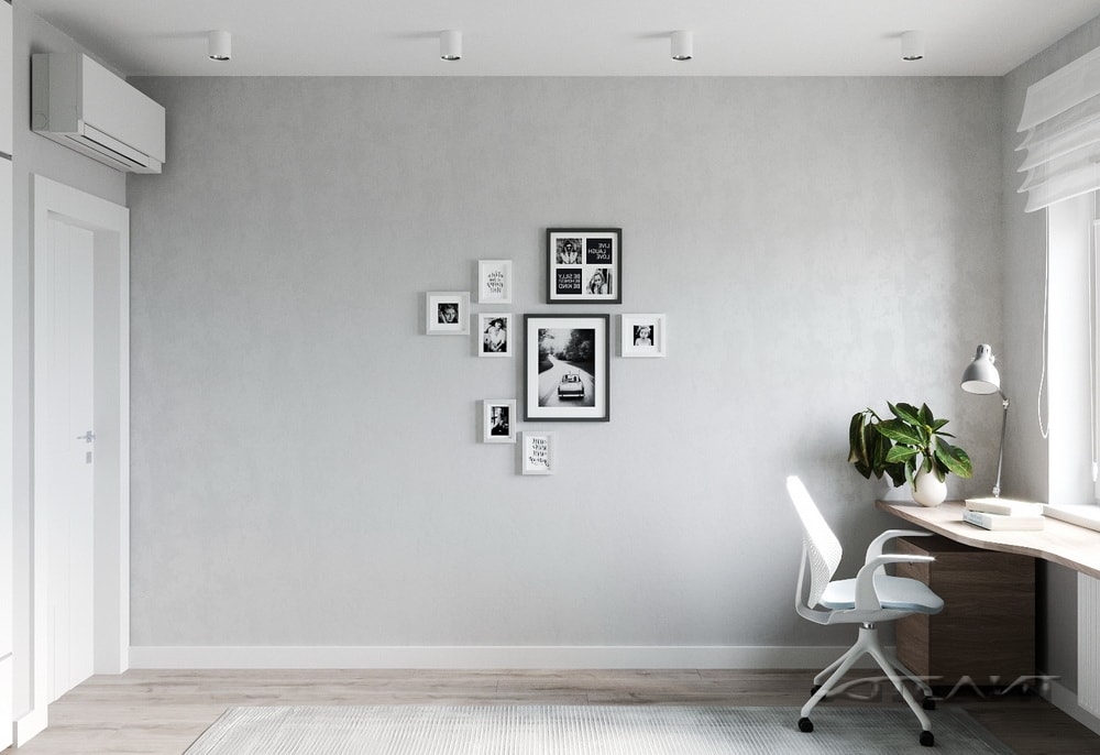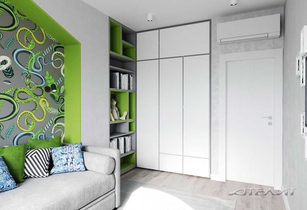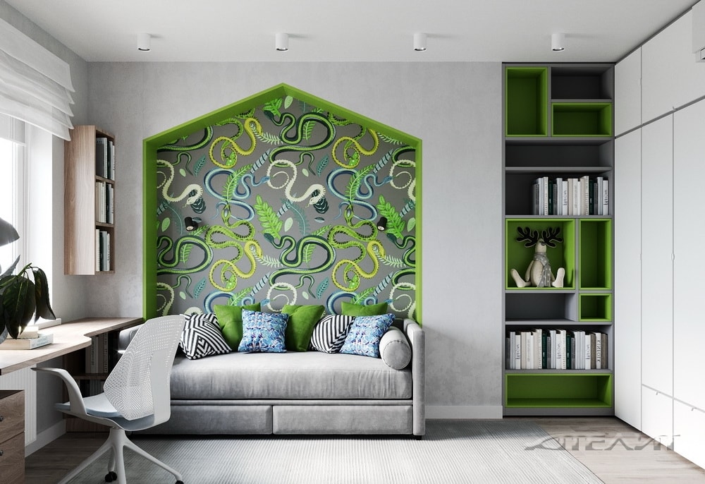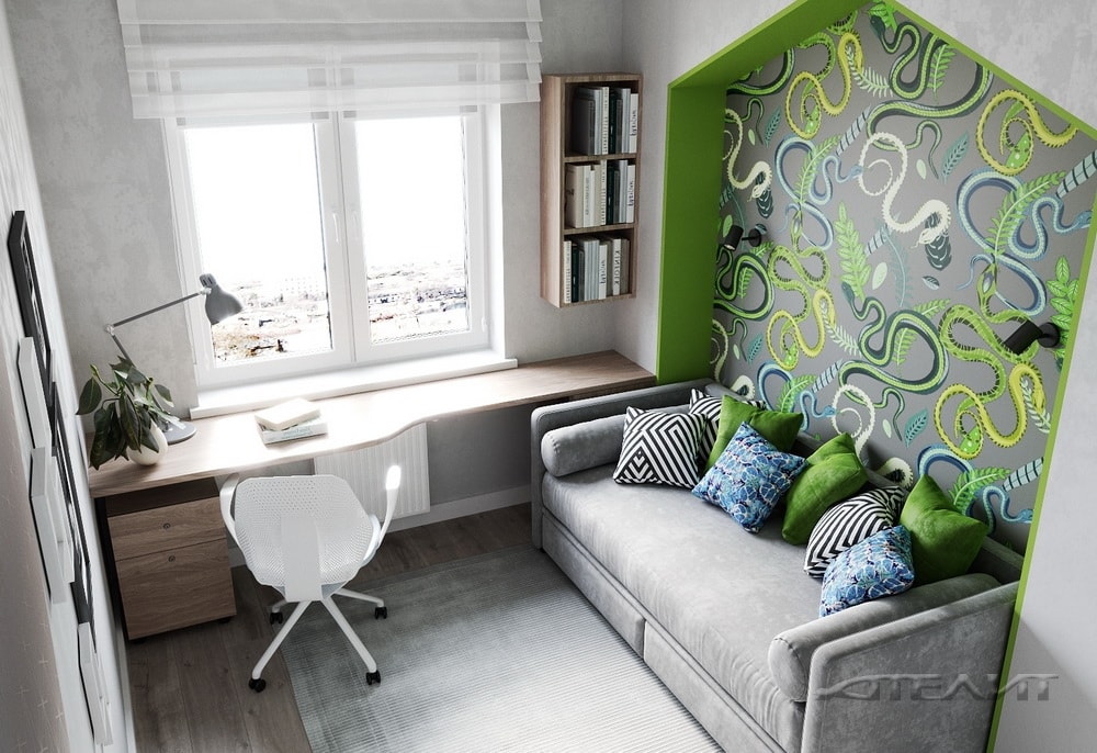 Компактная комната оформлена с использованием серо-стального, бежевого и различных оттенков зеленого. Роль акцентных элементов выполняет стена за диваном и расположенные напротив фото в красивых рамках. Вдоль стенки у окна обустроена комфортная рабочая зона. Данное расположение позволяет в полной мере использовать преимущества естественного освещения. Для хранения вещей предусмотрен вместительный встроенный шкаф и несколько полок.