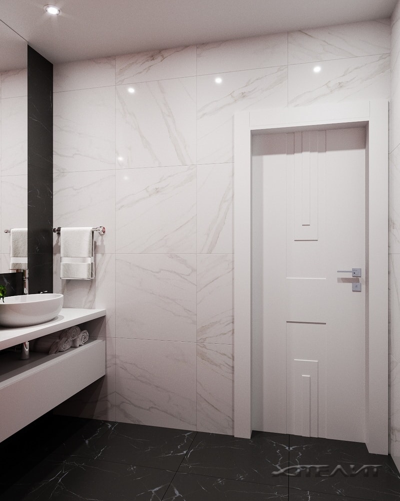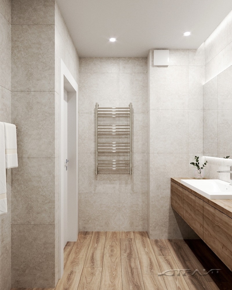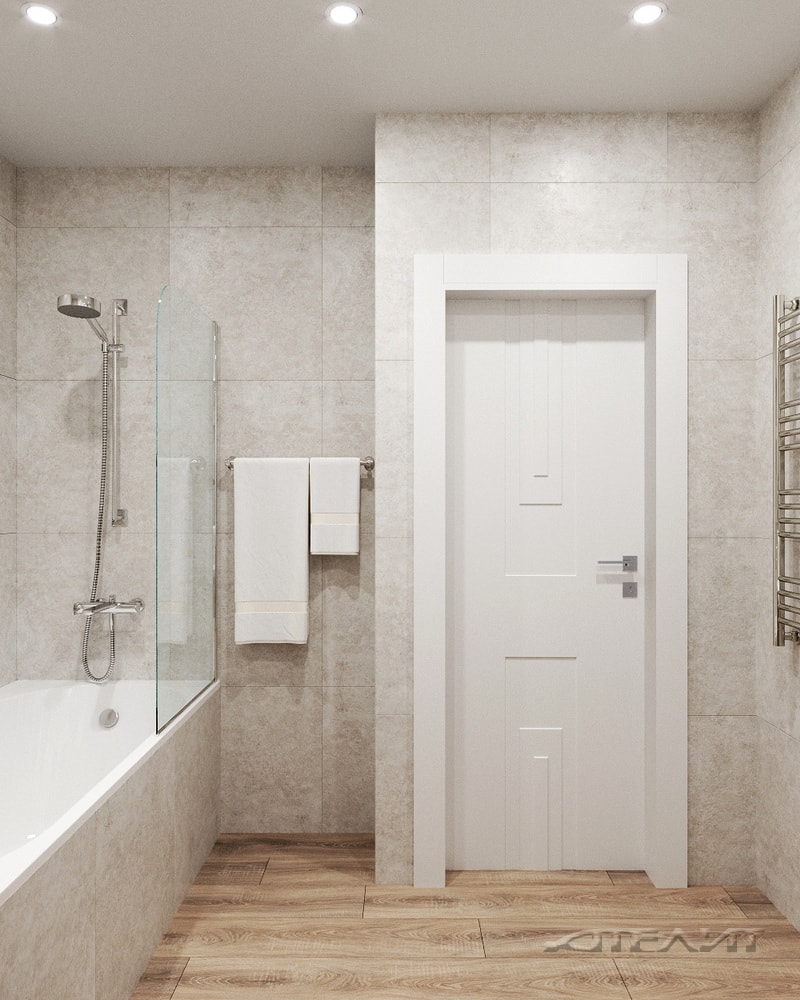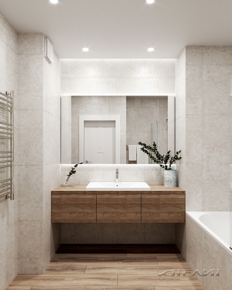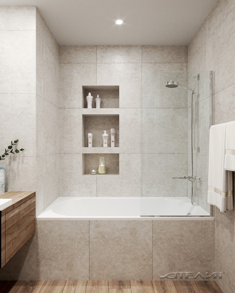 В компактном помещении размещена полноразмерная ванна. Интерьер оформлен в бежевом цвете с использованием крупной декоративной плитки. Нашлось место для полок и шкафчиков для хранения косметики.