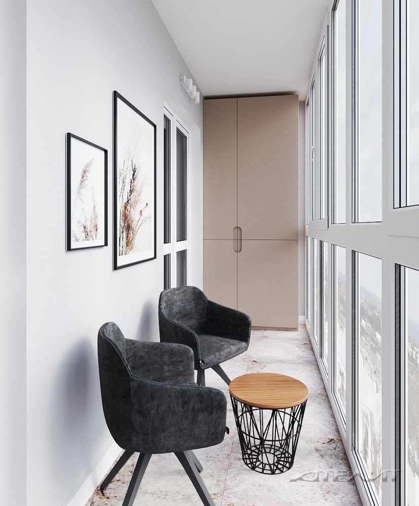 По желанию заказчиков здесь оборудована дополнительная зона отдыха. В оформлении использованы белый и бежевый тона, что удачно перекликается с цветовой гаммой жилых комнат. Установлены удобные кресла и журнальный столик.