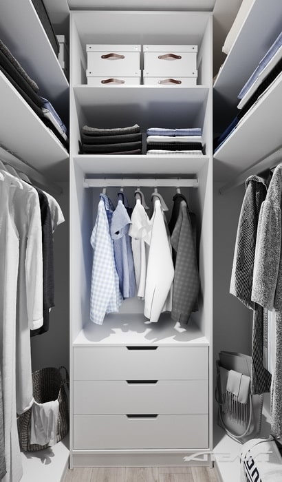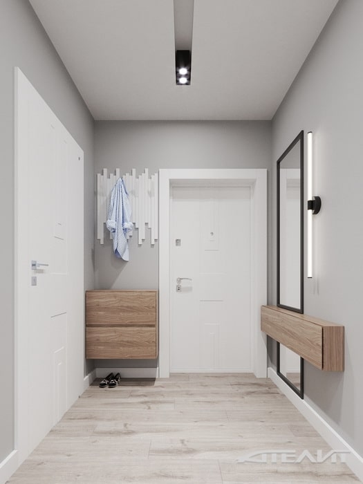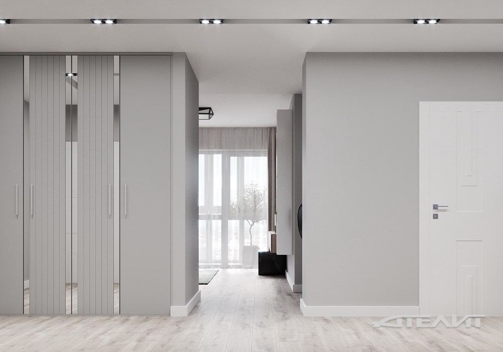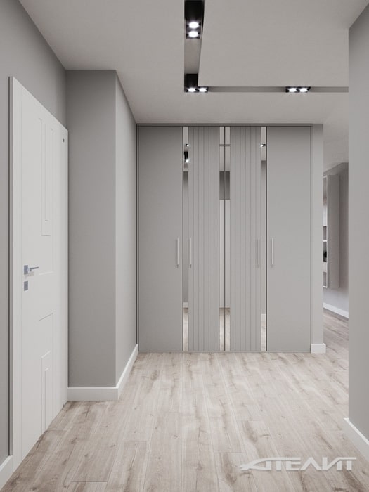 Гармонично вписались встроенные большие шкафы для хранения одежды, а зеркальные вставки в дверях смотрятся как декорирование стены.