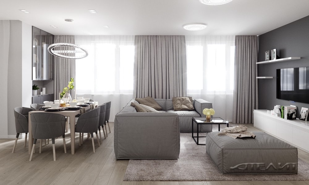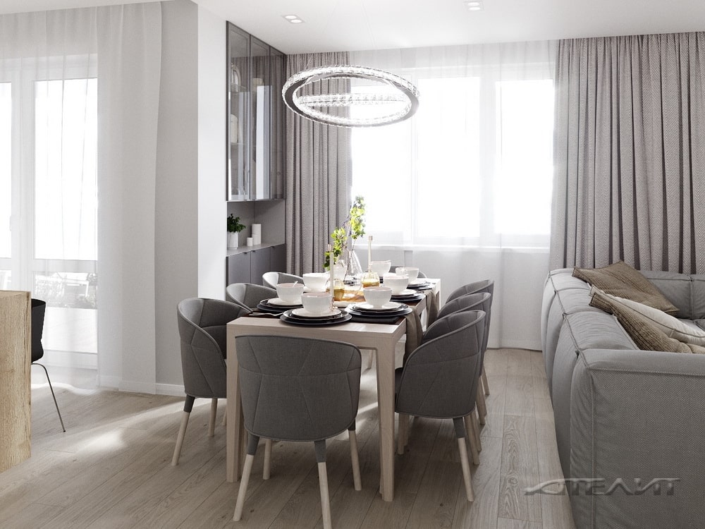 Специалисты компании «Ателит» объединили гостиную, кухню и столовую. Здесь много мебели, но ее количество нельзя уменьшить, потому что именно здесь по вечерам собирается вся семья. Чтобы не перегружать помещение, дизайнеры отказались от дополнительных элементов зонирования. Особый шарм помещению придает дизайнерский светильник над обеденным столом. Использование в отделке натуральной древесины сделало помещение теплее.