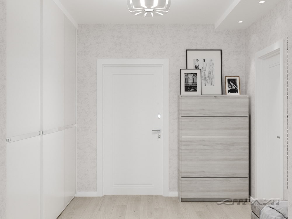 В отличие от гостиной-кухни, интерьер которой построен на контрасте, прихожая оформлена преимущественно в светлых тонах. Достаточная площадь помещения позволила установить здесь крупный шкаф для верхней одежды и вместительный комод. Получилось стильно и практично.