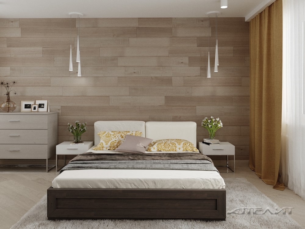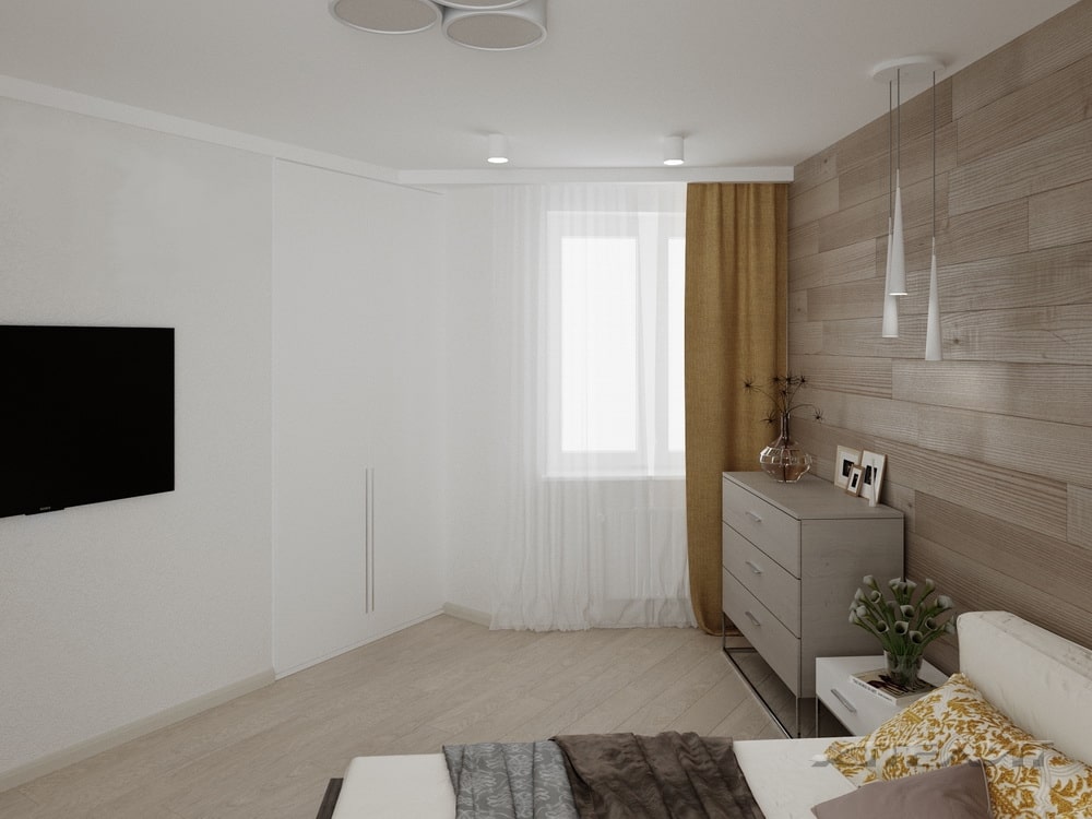 Дизайн комнаты выполнен в минималистичном стиле с элементами лофта. Тон задает стена, оформленная под дерево, и дизайнерские светильники. Для удобного хранения вещей добавили вместительный встроенный шкаф. В комнате нет лишних деталей, чтобы ничто не мешало комфортному отдыху.