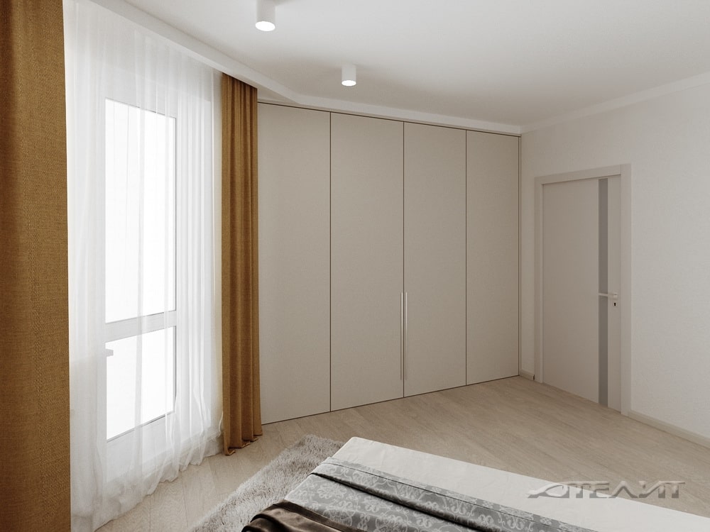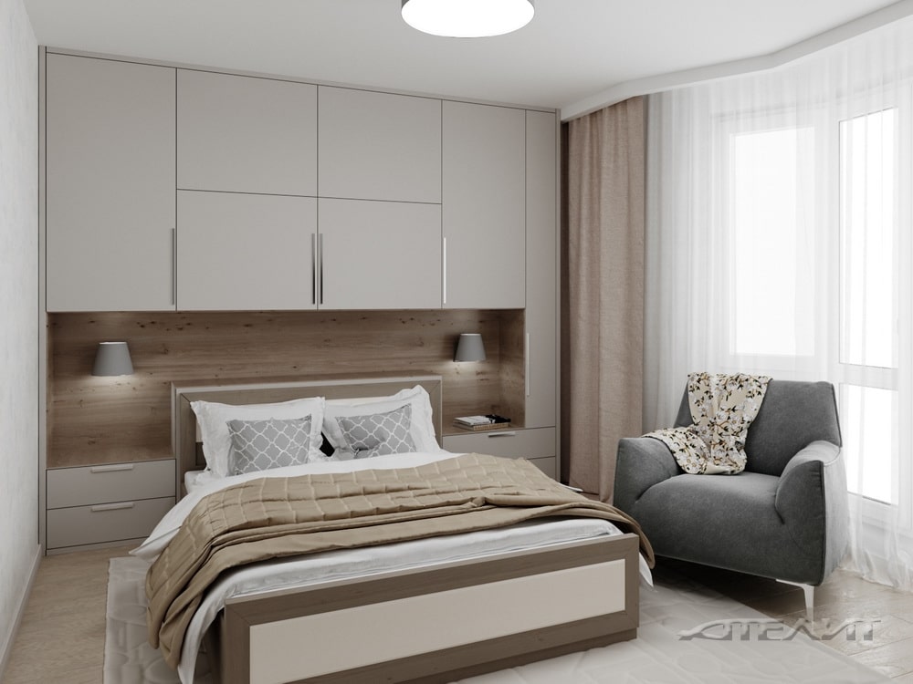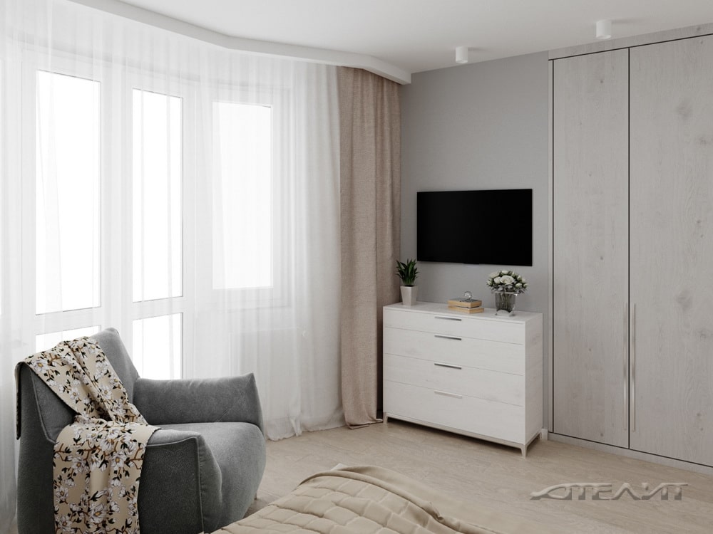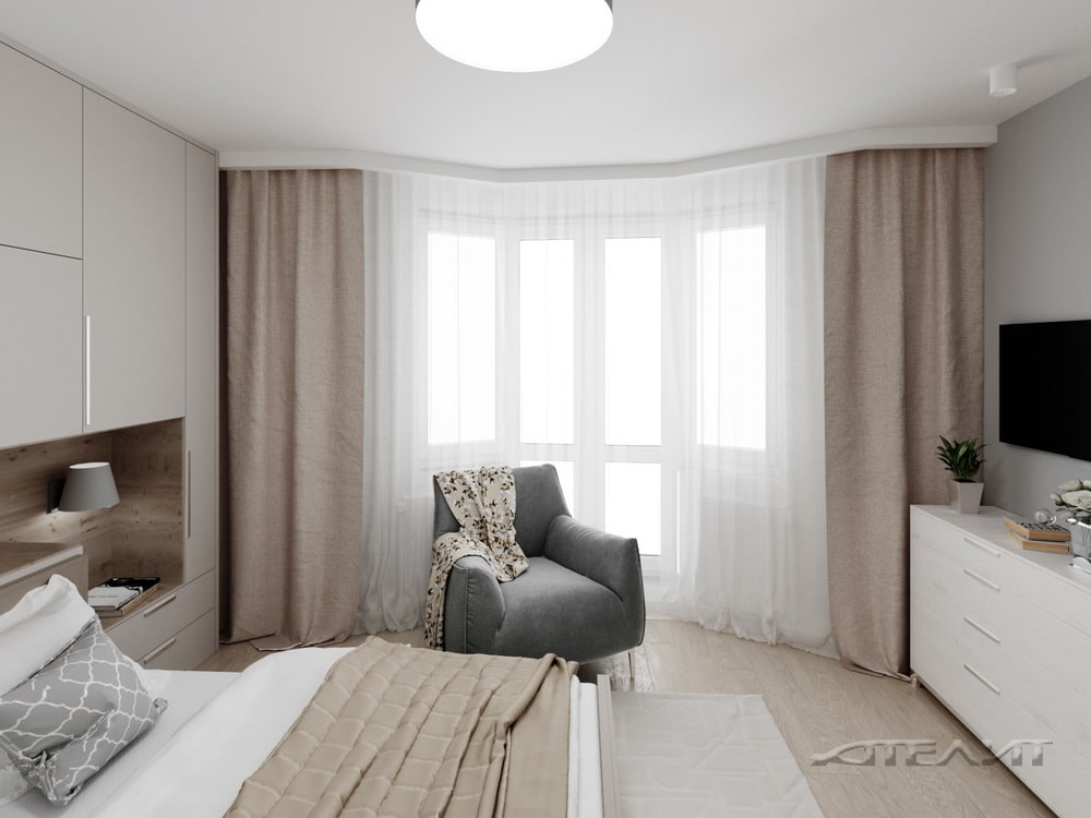 Комната оформлена в спокойных бежевых тонах, а чтобы помещение было теплее, в оформлении использовано дерево. Большой размер и необычная форма помещения позволили разместить здесь крупный встроенный шкаф-купе, а также шкаф у изголовья кровати. Нашлось место для удобного кресла напротив телевизора. А благодаря грамотному подбору фактур и цветов, комната не выглядит перегруженной.