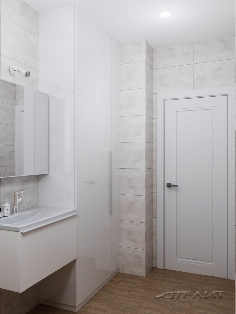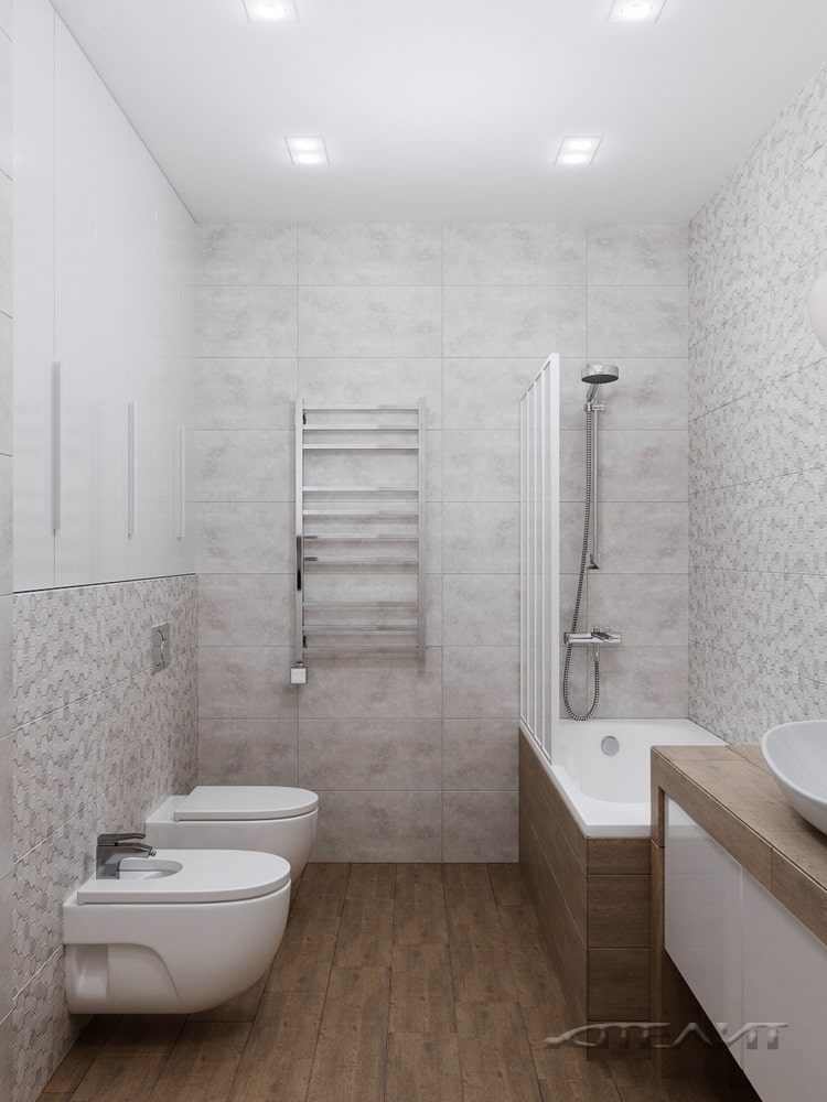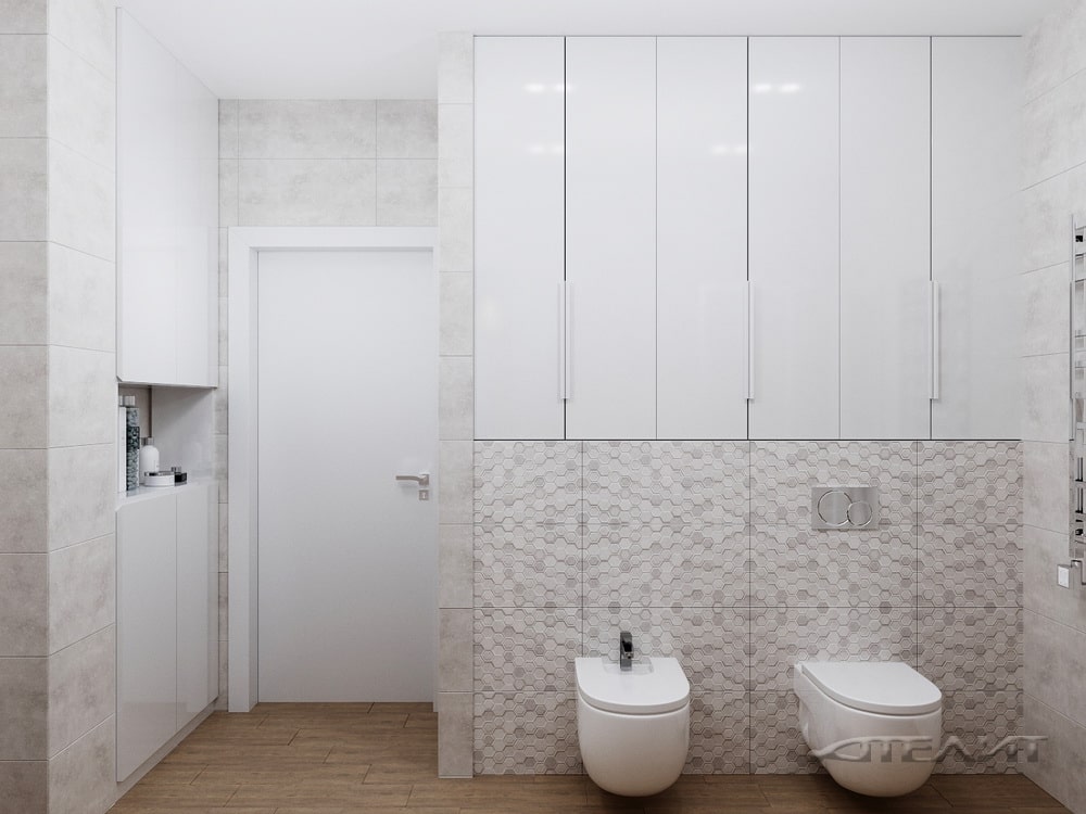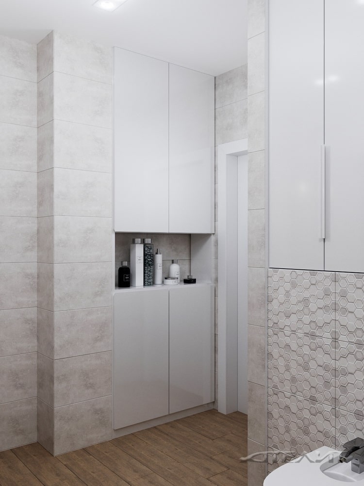 Здесь дизайнеры разместили полноразмерную ванну и всю необходимую сантехнику. Интерьер оформлен в светлых тонах. Спокойное оформление разнообразит рельефная плитка. Для хранения средств по уходу за домом и различных вещей предусмотрено несколько встроенных шкафчиков.