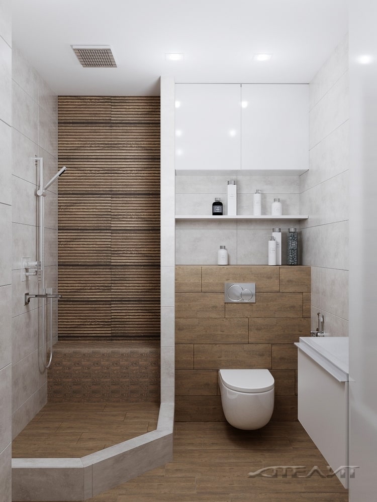 В помещении установили стеклянную душевую кабину. Чтобы на полу не скапливалась жидкость, кабину приподняли относительно плоскости пола. В качестве отделки использована крупноформатная плитка и дерево.
