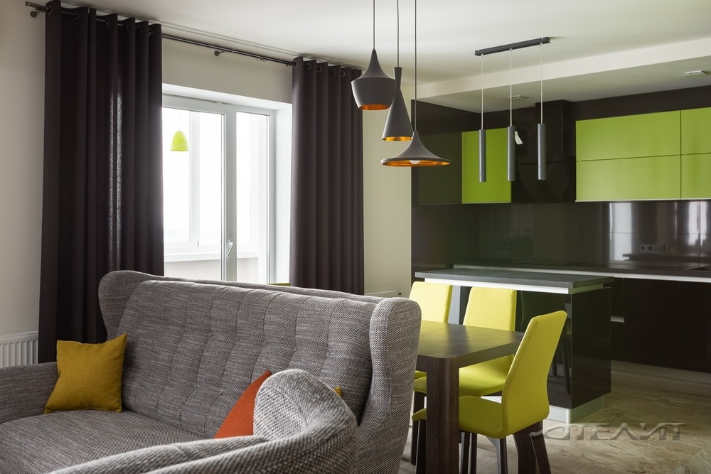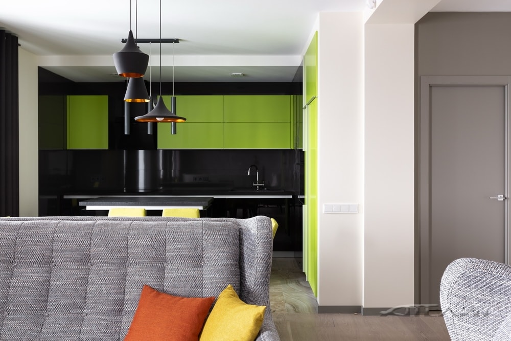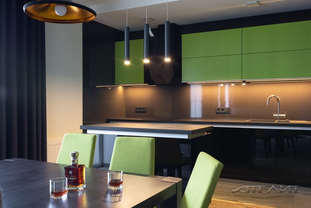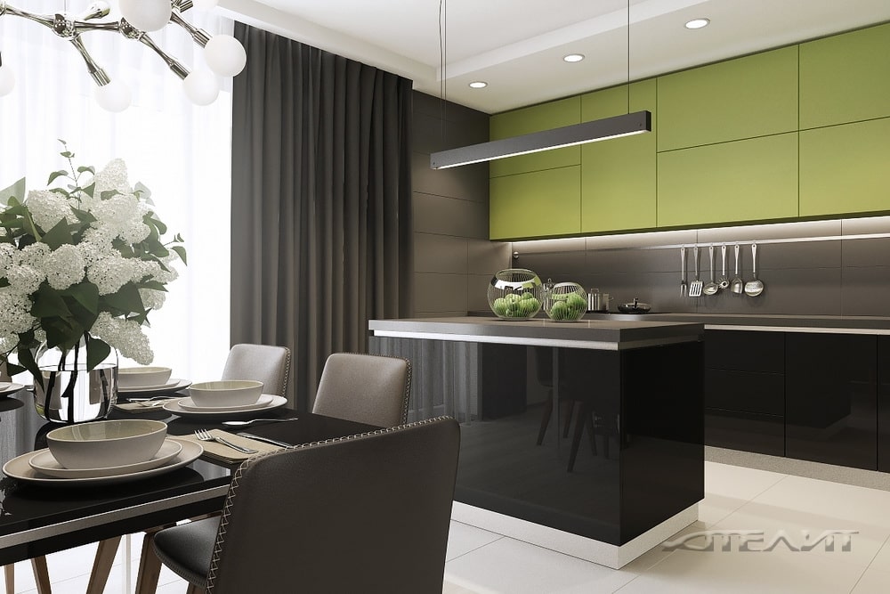 Кухня обустроена по последнему слову техники. Что касается мебели, то здесь обилие идеально ровных, в т.ч. отражающих, поверхностей. Монохромную цветовую гамму разбавляют ярко-салатовые акценты.
