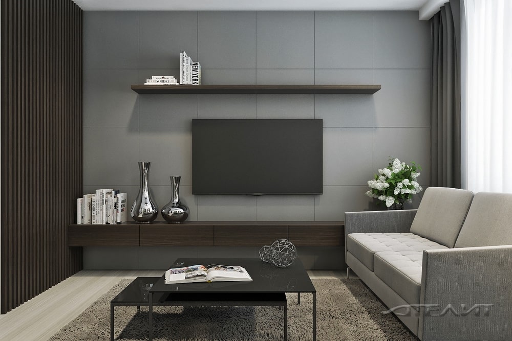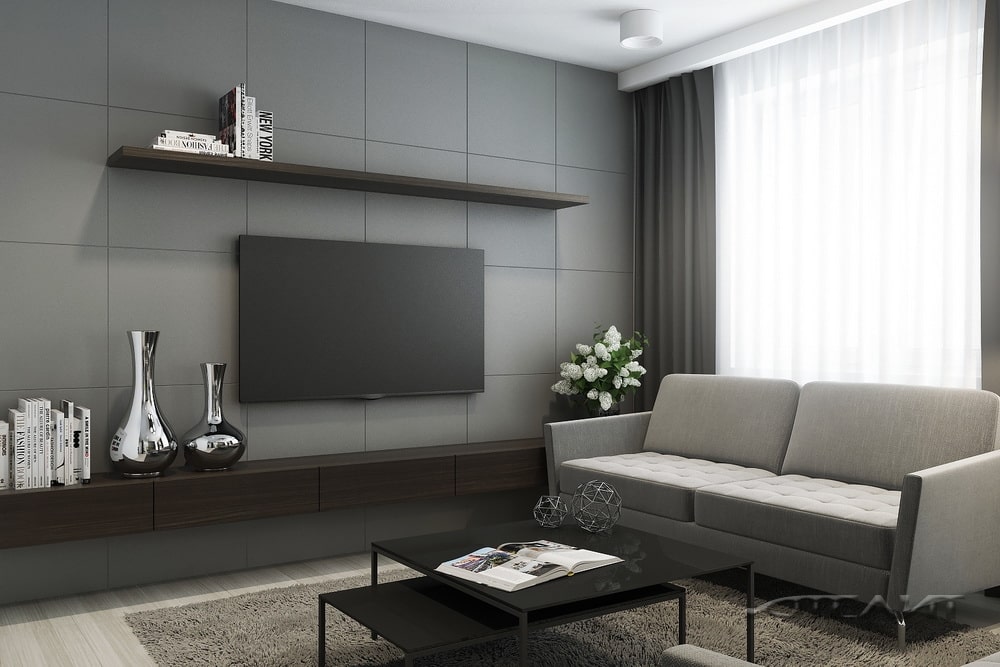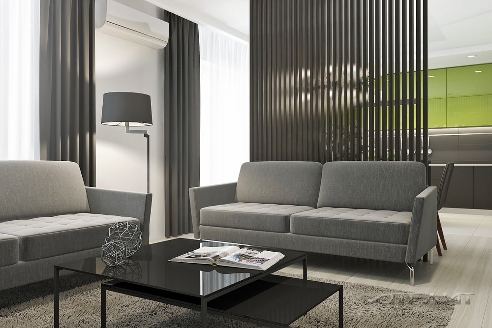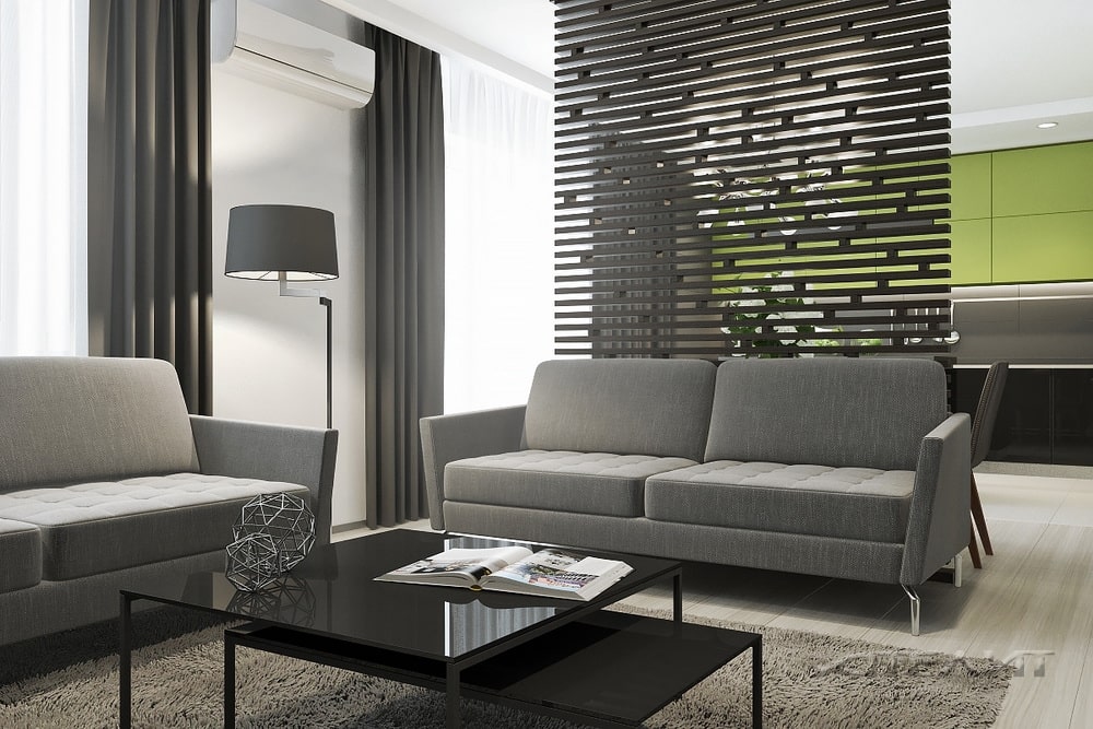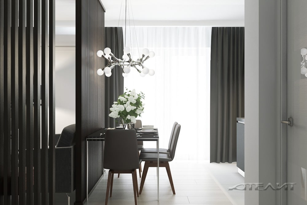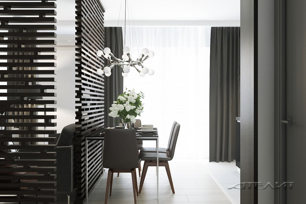 Стильное пространство, которое, несмотря на доминирование светло-серой гаммы с темными акцентами, не выглядит холодным. Здесь приятно встречать гостей и отдыхать после тяжелого рабочего дня. А эффектная перегородка не только разделяет зоны гостиной и кухни, но и выполняет роль оригинального акцента.
