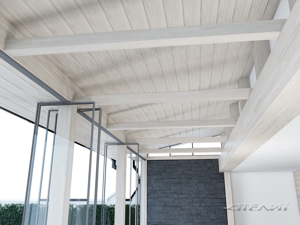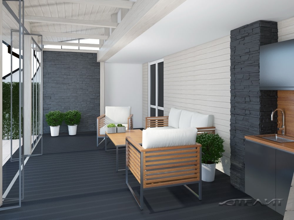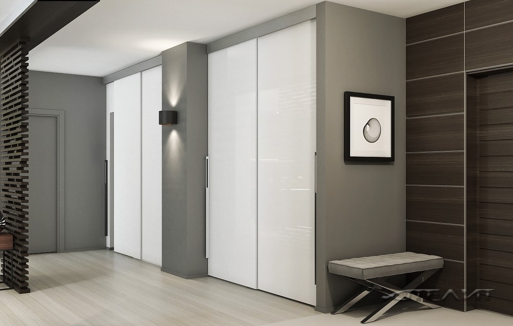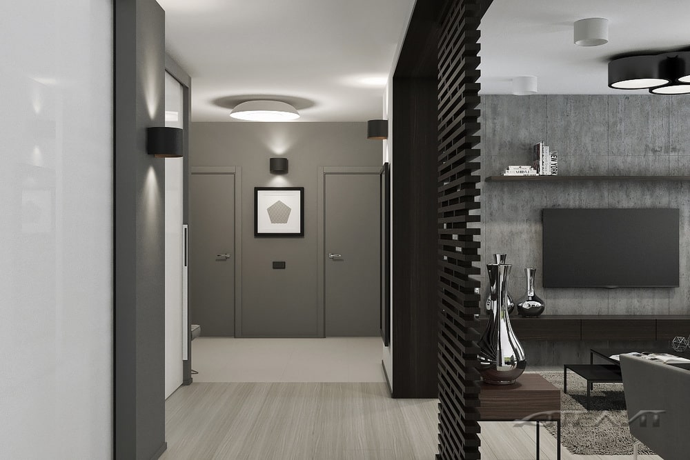 Данное цветовое решение перекликается с реализованным вариантом гостиной и кухни – холодные монохромные тона с темной деревянной перегородкой.