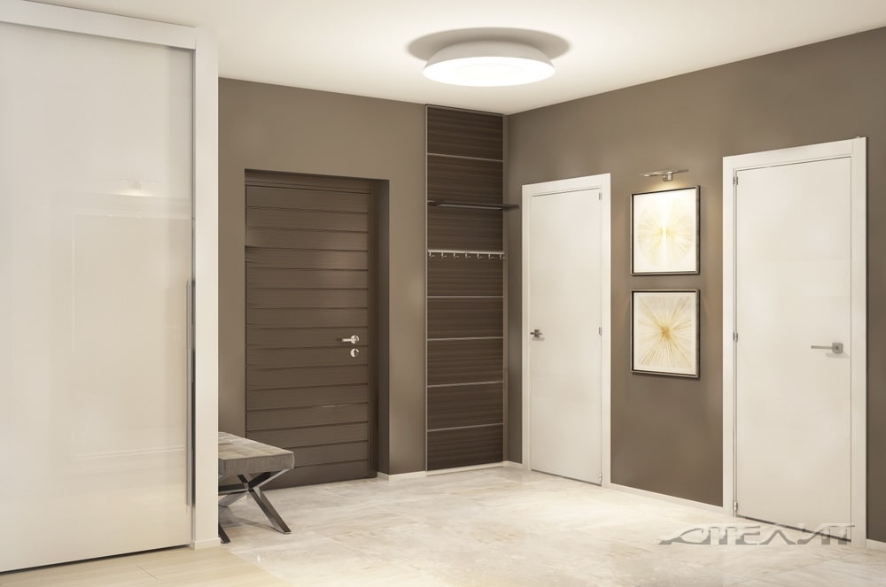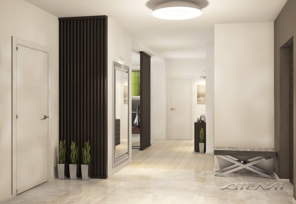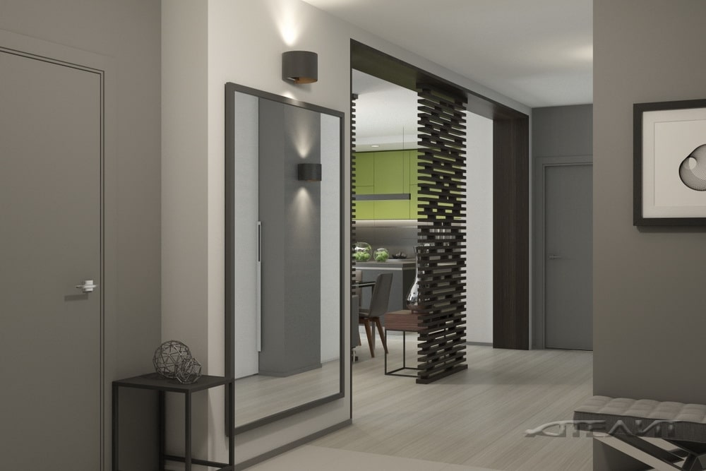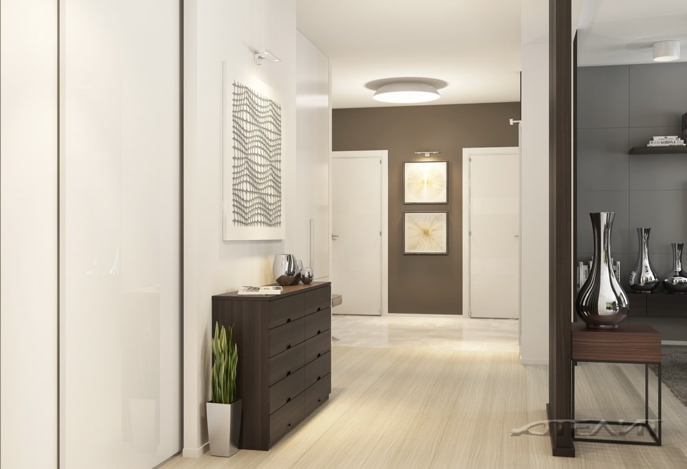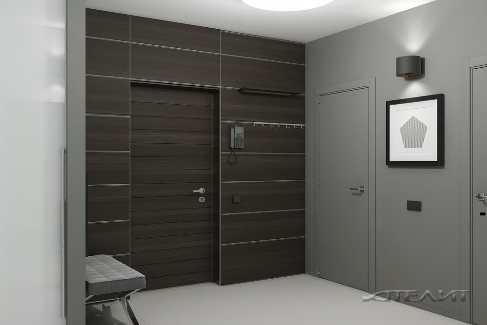 Более светлая и теплая прихожая, которая не вносит дисбаланс в более холодные тона гостиной.