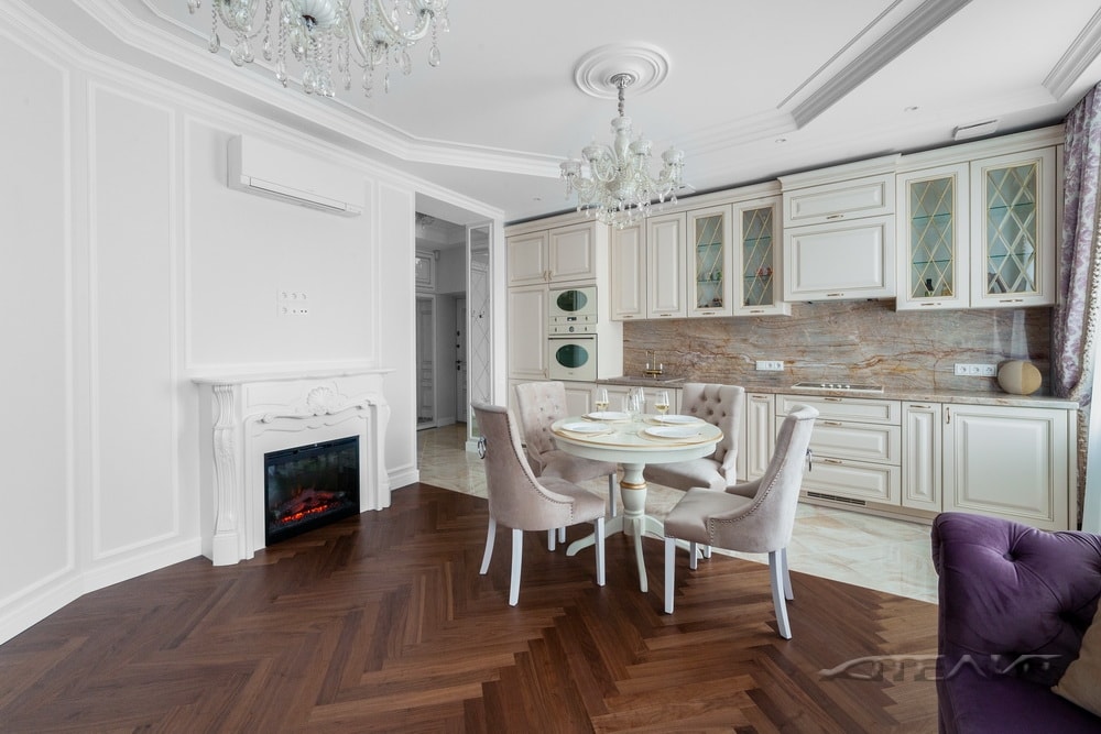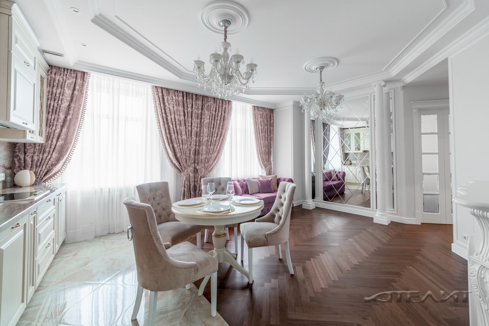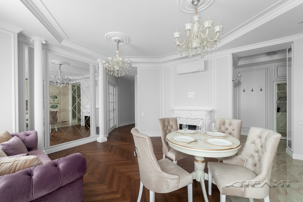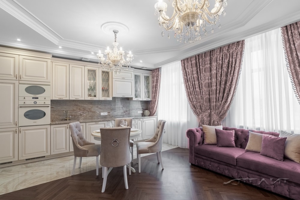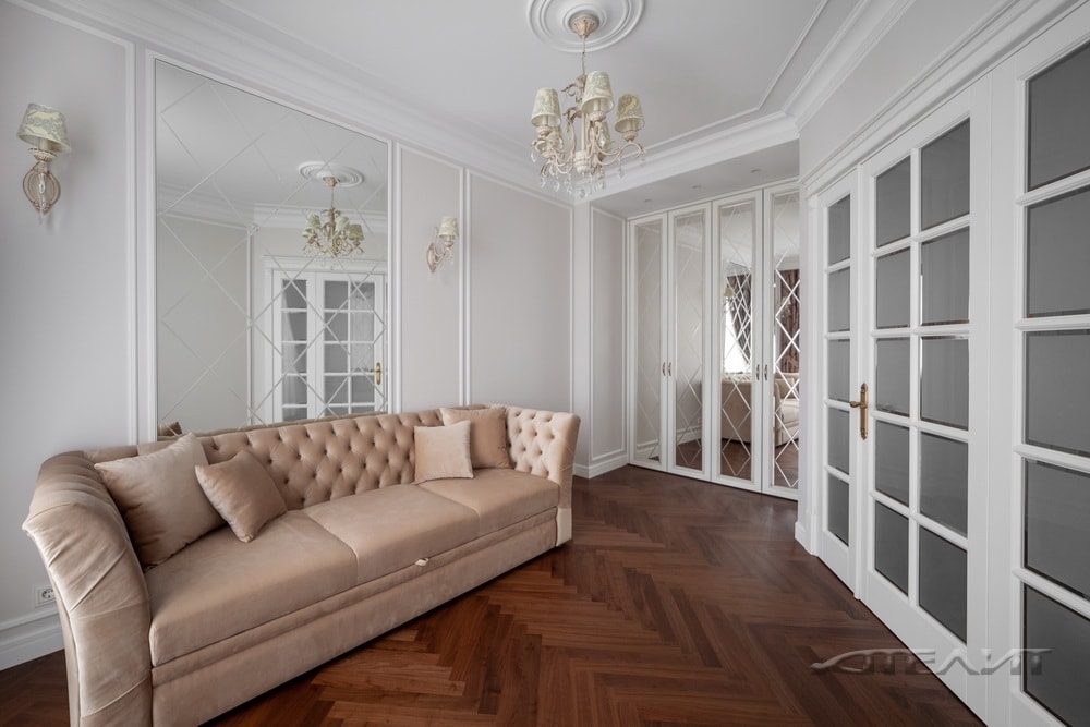 Интерьер выполнен в классическом стиле с элементами модерна. При этом, в соответствии с современными тенденциями, убрано все лишнее. Благодаря этому комнаты не выглядят перегруженными, несмотря на небольшую площадь. Заказчики остались довольны реализацией проекта.