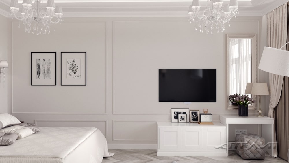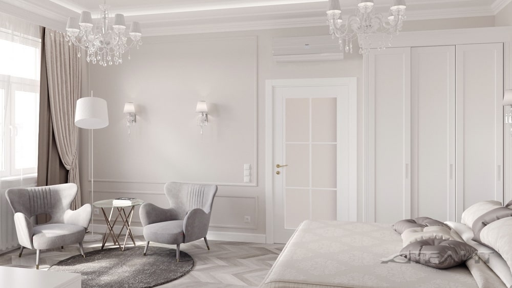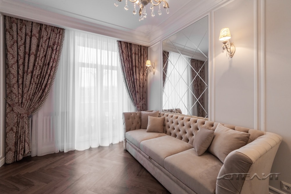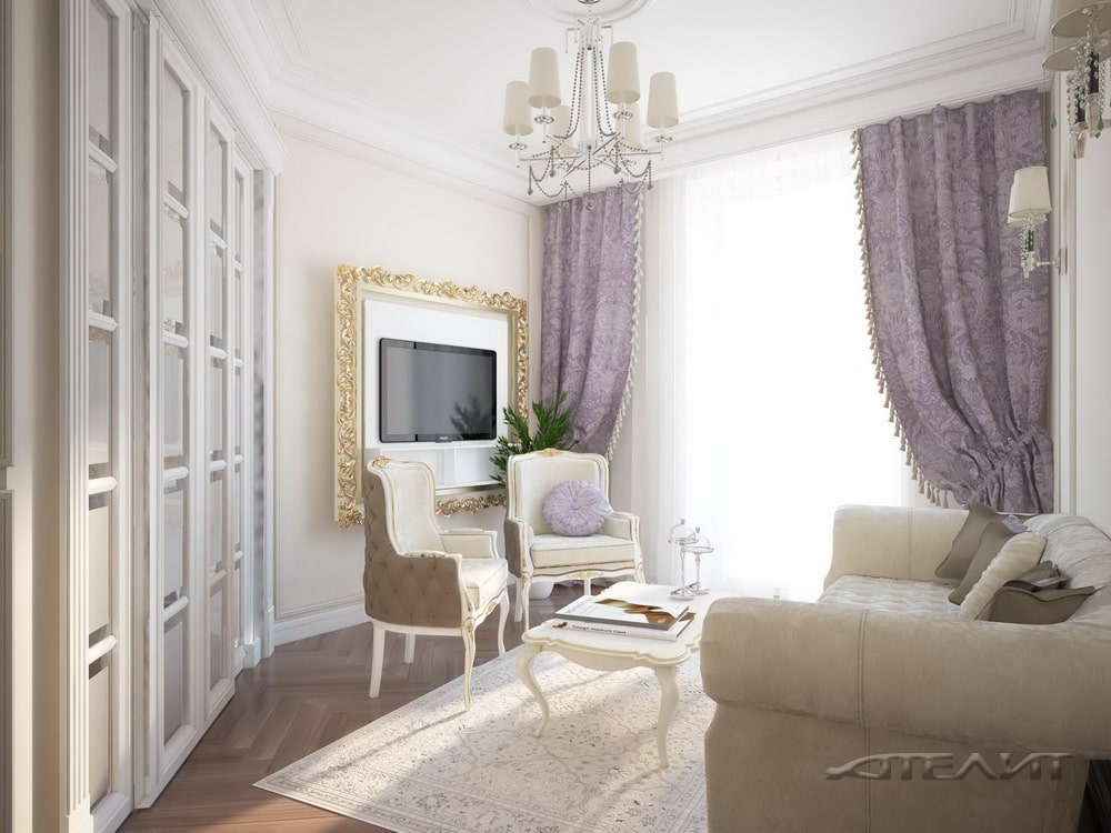 Помещение оформлено в классическом стиле с элементами модерна. Основной цвет — серый. Он по-разному обыгран шторами, полом и мебелью. Компактная комната гармонично сочетает функциональность ТВ-зоны и места для отдыха. У выхода на балкон размещен косметический столик с большим зеркалом.